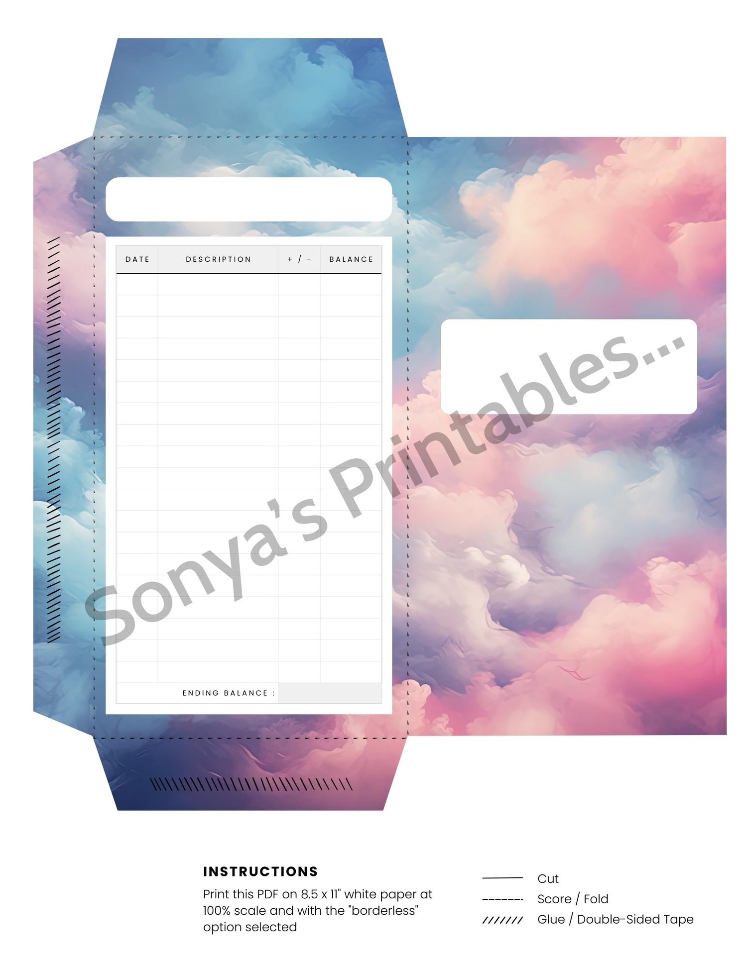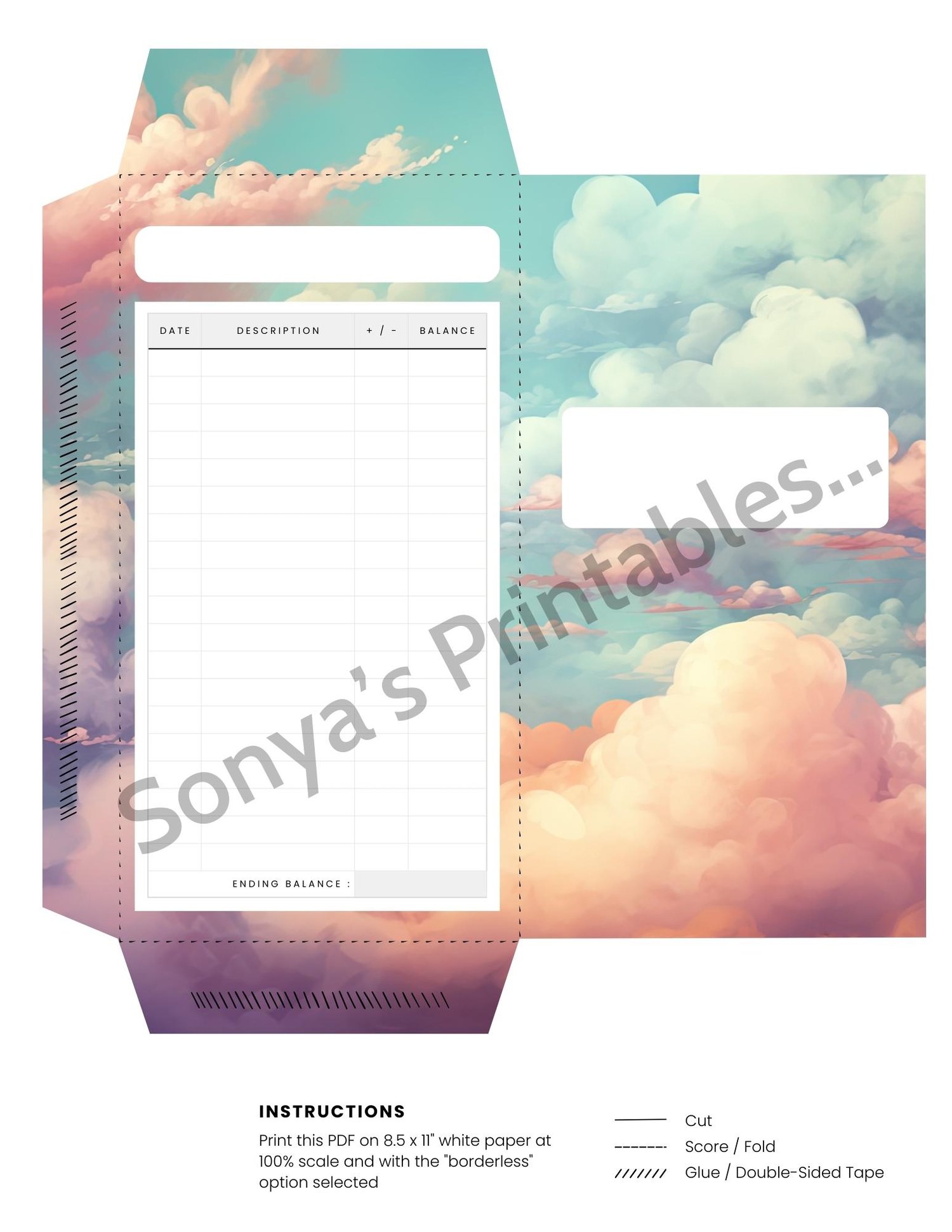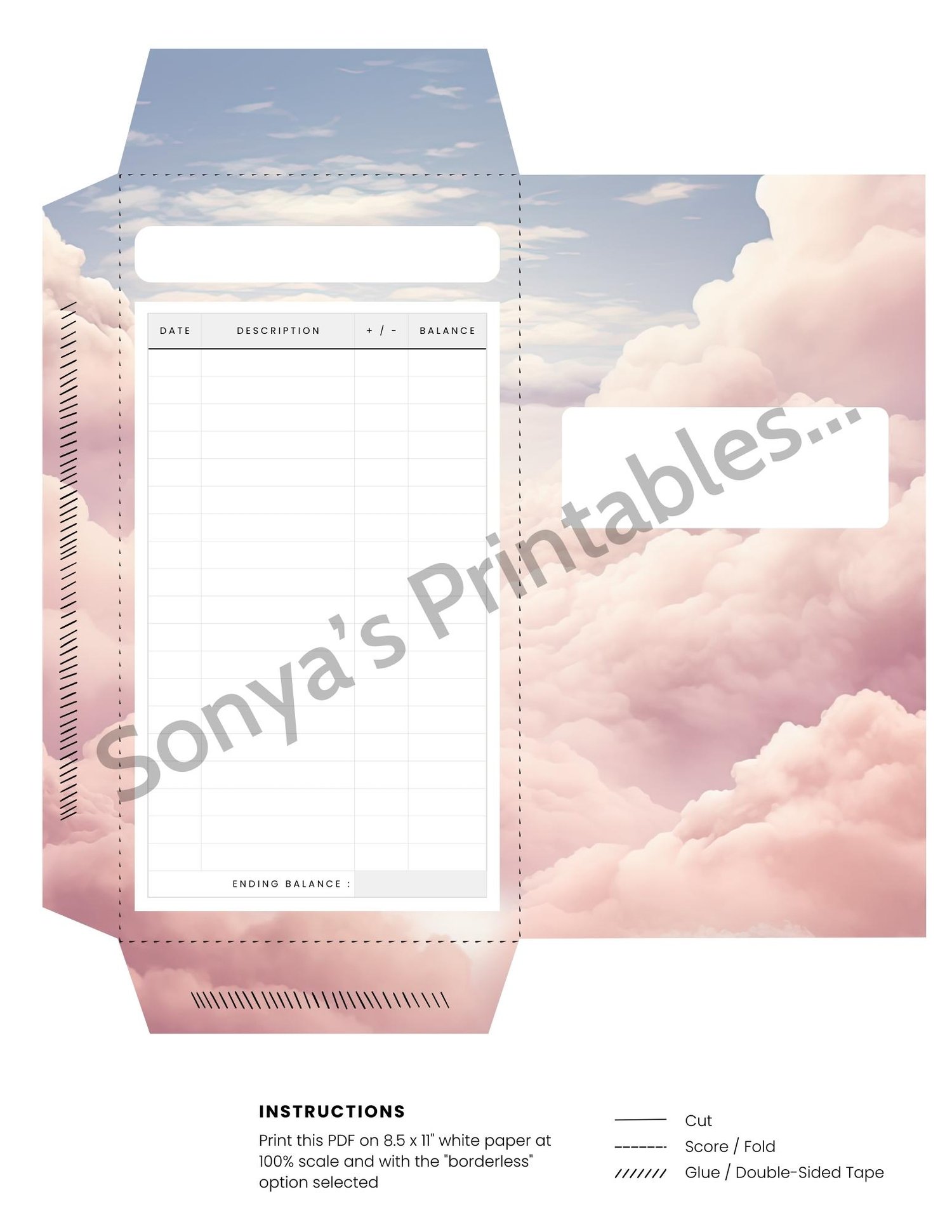 Stay on budget with these 10 pastel-colored cloud cash envelopes! Each comes with a fun and easy-to-navigate expense tracker, so you can be sure you're staying in the 🌈! Plus, you'll get the satisfaction of physical stuffing, so you know you're really using your 💰 responsibly. It's your bank account's dream come true!🙌 Order these Cash Stuffing Envies today! It's a very easy-to-follow printable template. Just print, cut and glue (or tape).