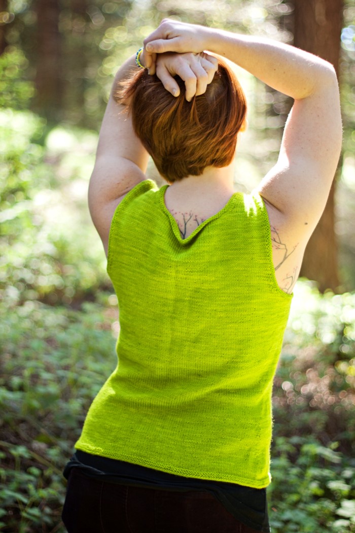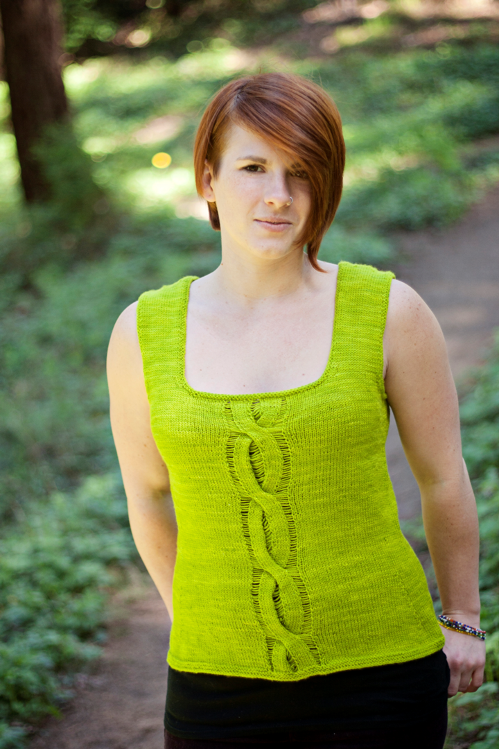 May is the month when the days start to really warm up for much of the US and Europe—the month when dancers of all types come out of their winter stupor and take to the streets and fields to celebrate the return of spring and life. This tank top is knit in the lovely fingering-weight Baah La Jolla yarn, making it light and airy for the hottest weather. The central cable stitch uses dropped stitches to further play with the idea of airy solidity.