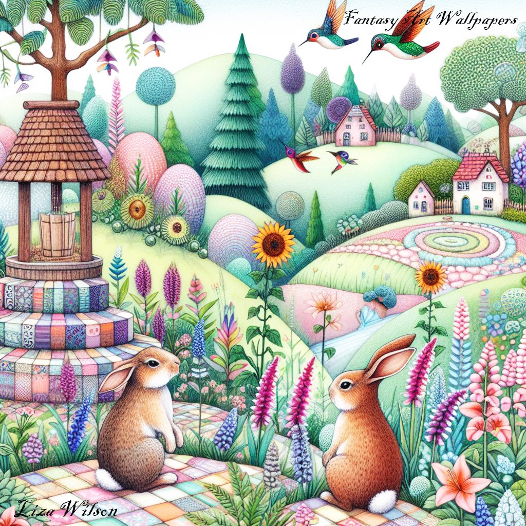 Cute rabbits on high patterned hills by a wishing well. There are flowers, trees & humming birds.