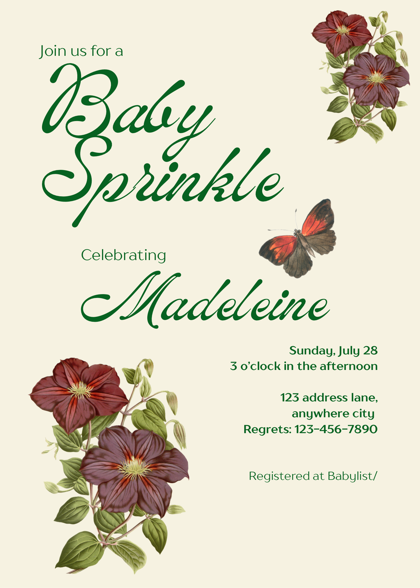 Red Flowers and Butterflies Baby Sprinkle Invitation Editable Canva Template