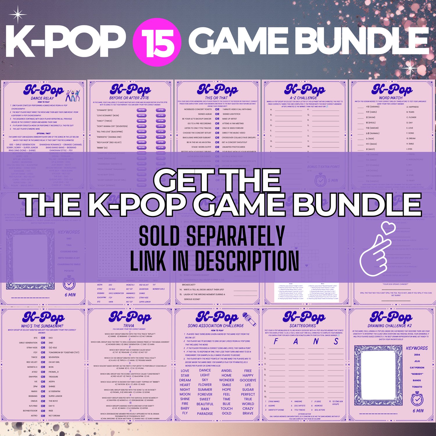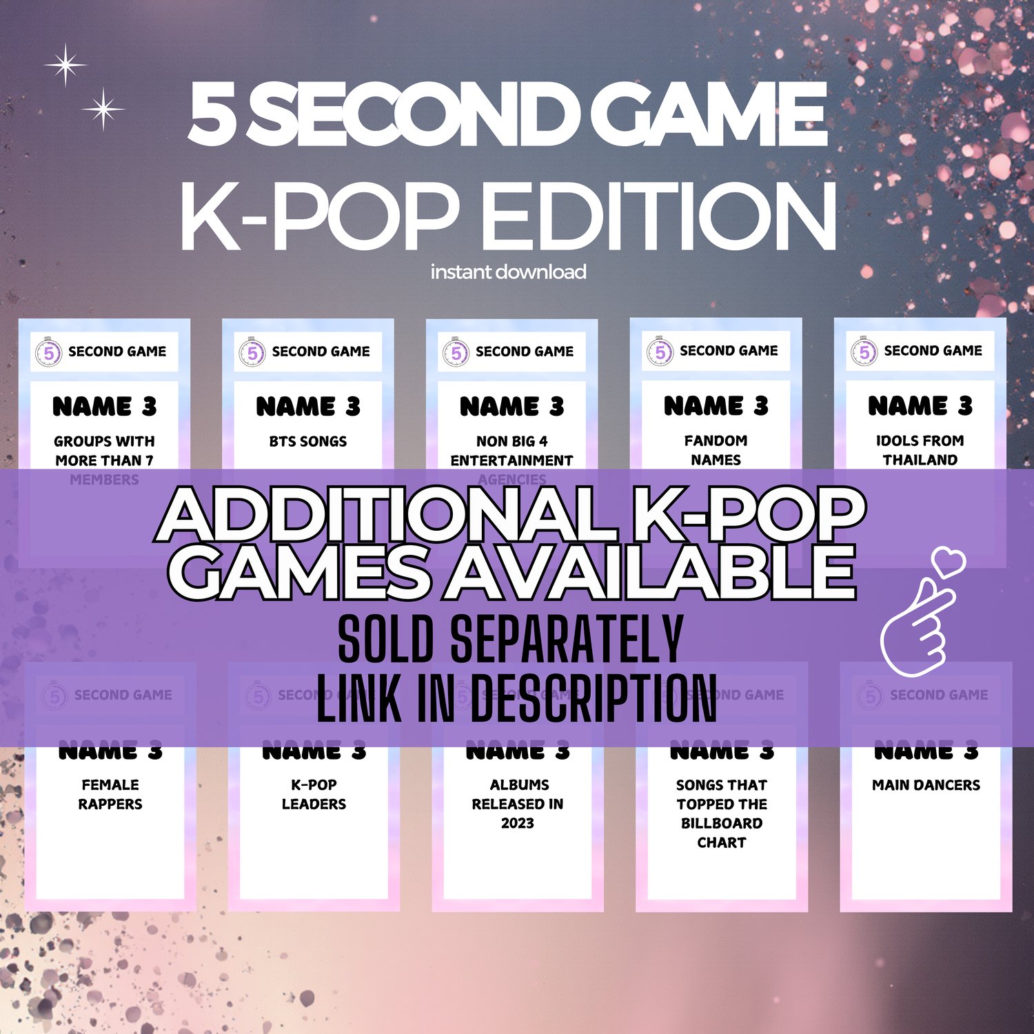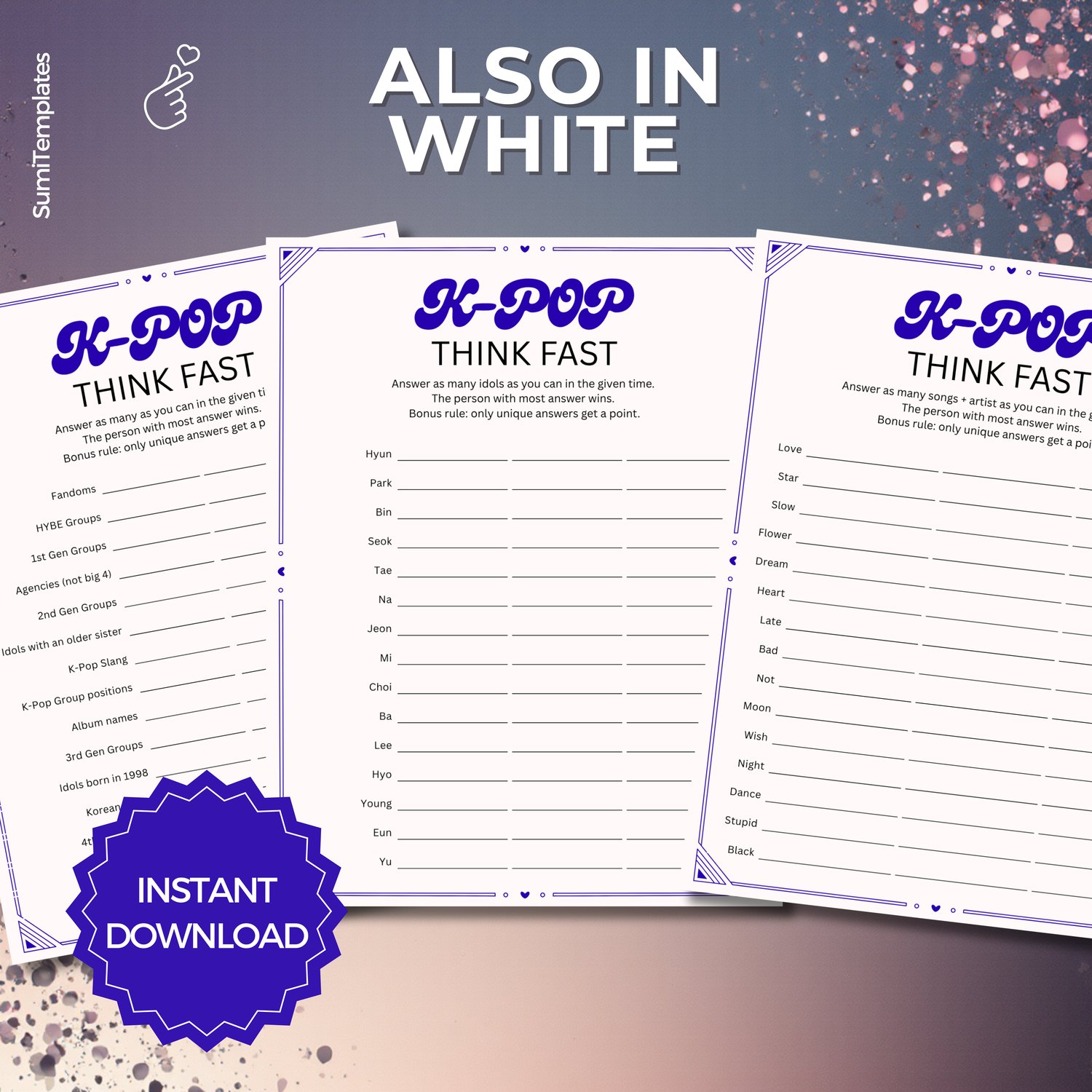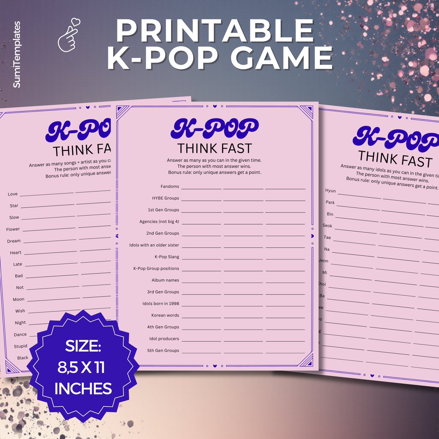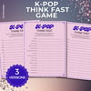 How quickly can you answer the questions and name K-Pop songs, idols, or groups before the timer runs out? This K-Pop Think Fast Game is perfect for parties, game nights, and fan meetups.