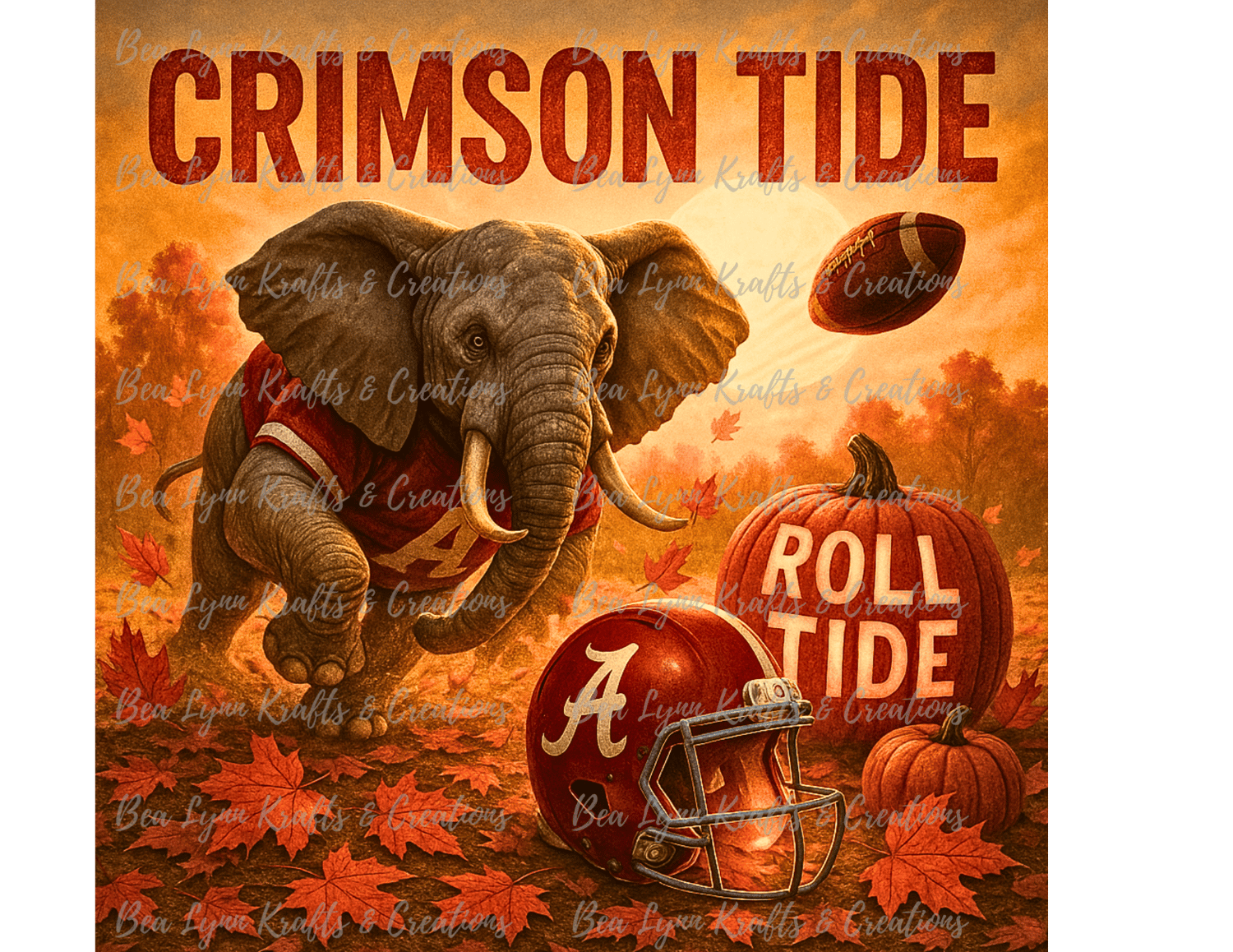 🐘🍁 Roll Tide, all season long! This Alabama Crimson Tide PNG brings football pride and fall spirit together in one powerful design. Featuring the iconic elephant mascot charging forward in a Crimson jersey, a bold “CRIMSON TIDE” headline, a glowing full moon, flying football, and pumpkins carved with “ROLL TIDE,” this artwork captures the heart of Alabama football with an autumn twist. A detailed Crimson Tide helmet on a bed of fall leaves makes this design a game-day essential for the Bama faithful.