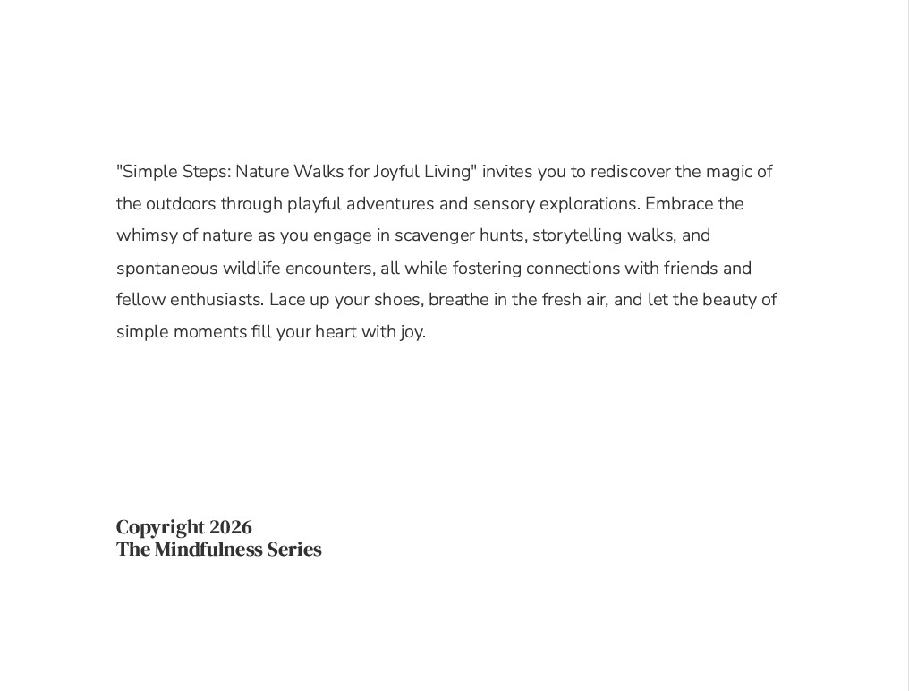 "Simple Steps: Nature Walks for Joyful Living" is your irreverent, soul-soothing guide to rediscovering the Great Outdoors—even if your idea of "outdoors" is just the patch of grass next to the parking lot.
