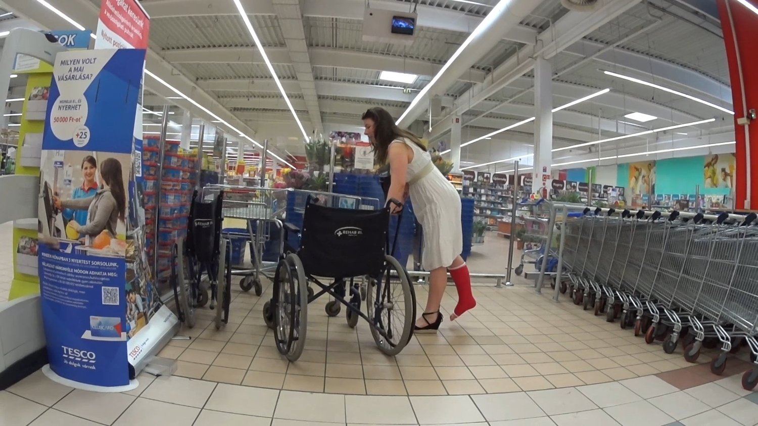 Natisha is on her way in to a grocery store.She has a nice white dress, a black wedge heel shoe on her left foot and her red short leg cast on the right leg.On her way in she find a wheelchair but she is not sure if she can borrow it so she countine to crutch in to the store.We following her around the store and try to get closeups as soon as we can.When she has buy what she need for the dinner tonight she pays and crutch back out to the car.