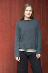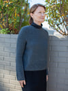 OBLIQUE is knit in the round from the bottom up with Nest and Silk Cloud held together throughout. Divided at the underarm, front and back are worked flat to the shoulder. Sleeves are knit flat from the wide cuff up, with a fitted elbow. Collar is picked up and worked in the round. Hem, cuffs, and collar feature oblique ribbing.