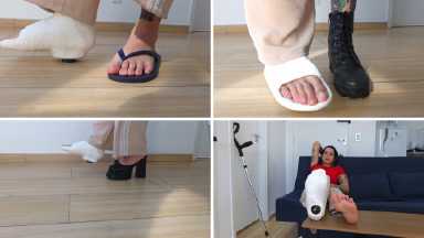 Rebeca tries on flip-flops, combat boots and high heels, and walks with crutches in each. Finally, she shows off her cast, foot and soles for the camera.