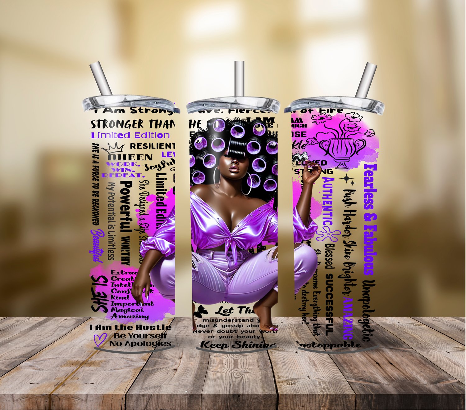 Celebrate strength, style, and self-love with this bold Crowned in Curlers digital design! Featuring a stunning Afrocentric woman adorned with vibrant curlers and surrounded by empowering affirmations, this high-resolution PNG wrap is perfect for 20oz skinny tumblers.