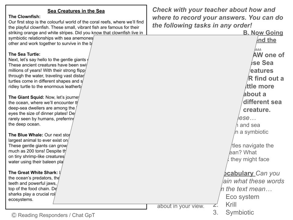 Sea Creatures Text and Comprehension tasks