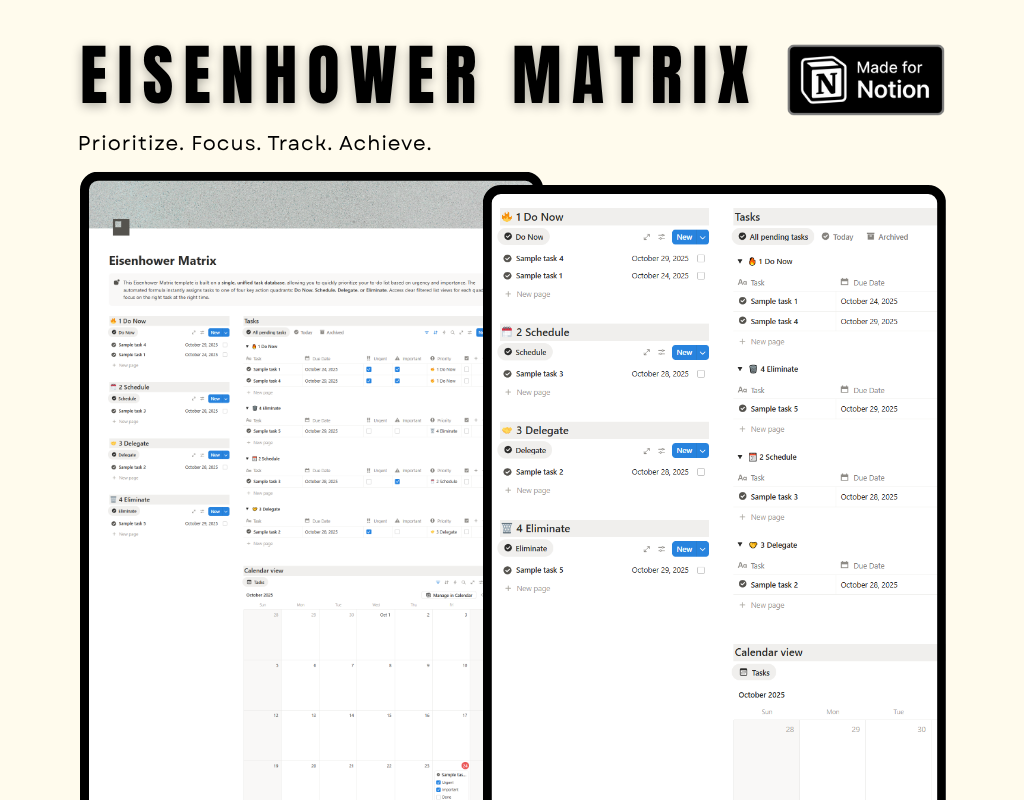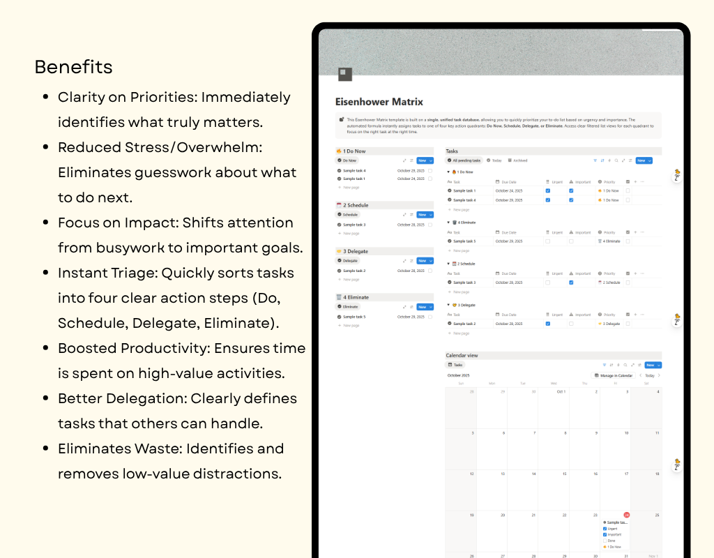 The template gives you instant clarity through four distinct, filtered list views, ensuring you focus on the right tasks at the right time. Your tasks are categorized into clear action zones: 🔥 Do Now (Crisis tasks), 🗓️ Schedule (Goal-driving tasks for deep work), 🤝 Delegate (Interruption tasks others can handle), and 🗑️ Eliminate (Low-value distractions to cut). This structure ensures your energy is strategically channeled away from busywork and toward high-impact activities that truly move your personal and professional life forward.