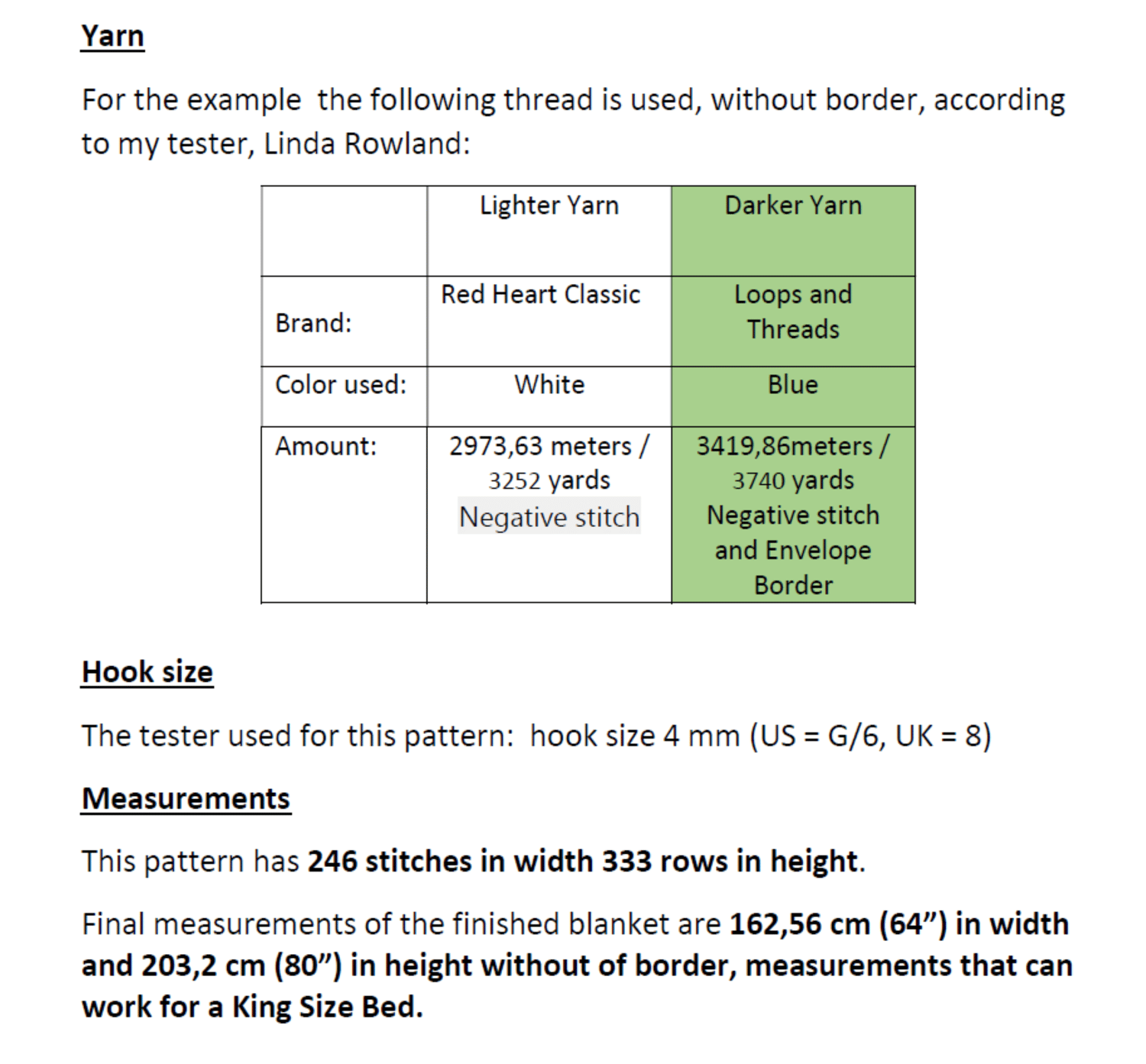 The amount of yarn used for this pattern by my tester without the border was: 2973,63 meters / 3252 yards (colour white of the Red Heart Classic brand) and 3419,86 meters / 3740 yards (colour Blue of the Loops and Threads brand)