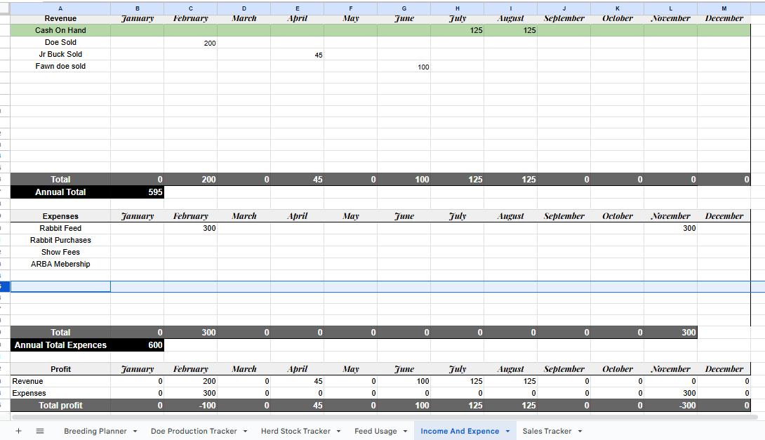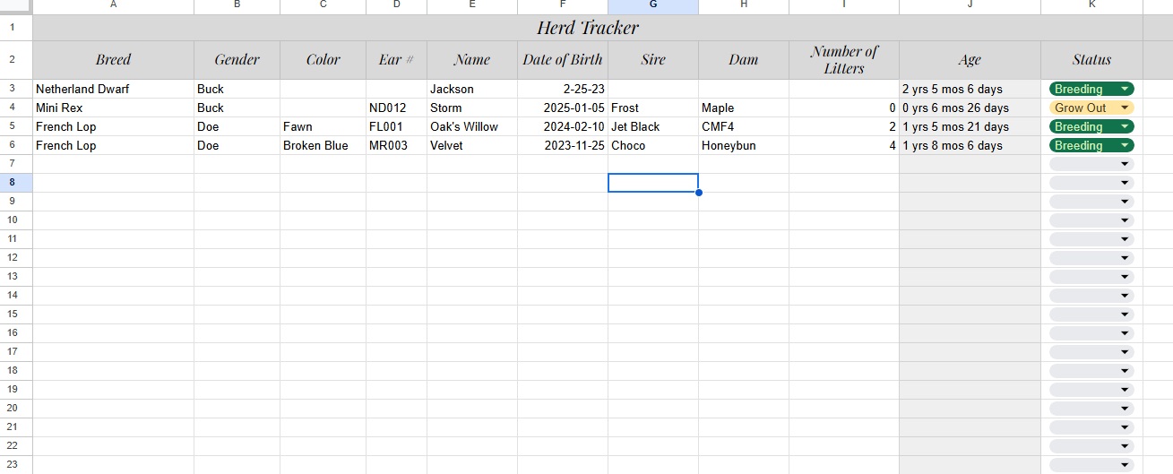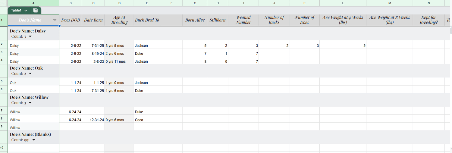 This sheet automatically calculates your total daily, weekly, and monthly feed usage (in ounces and pounds) across every age group in your herd:
