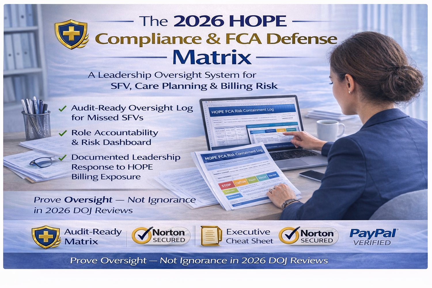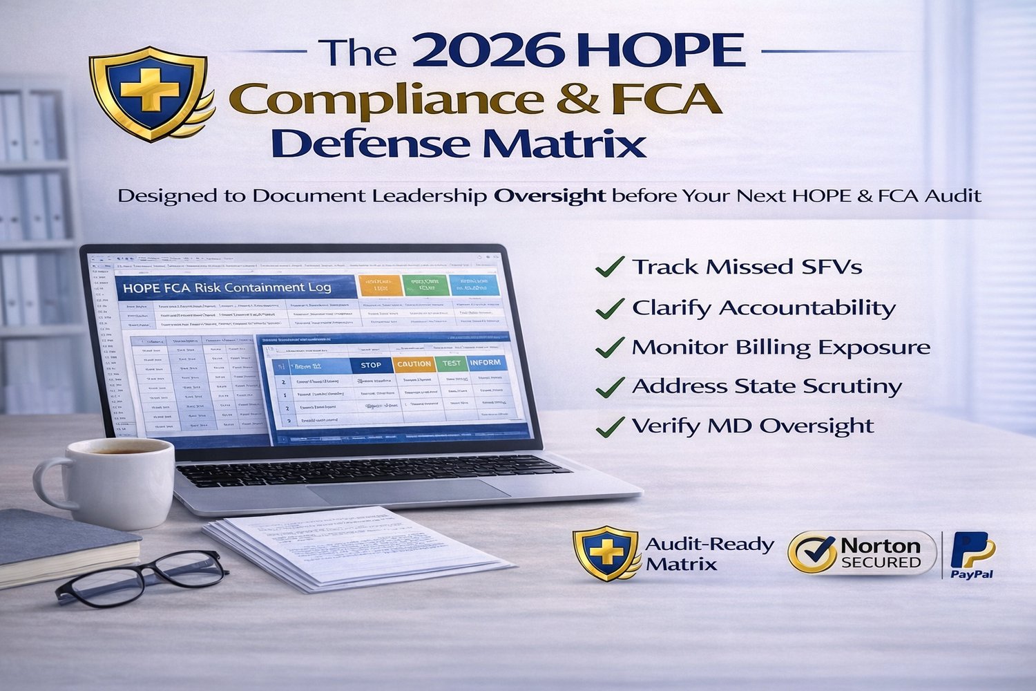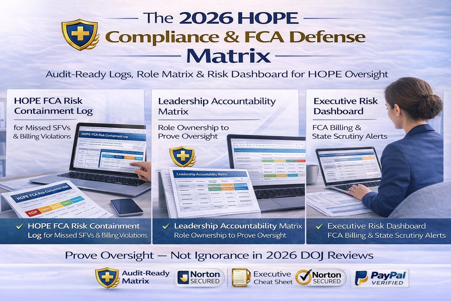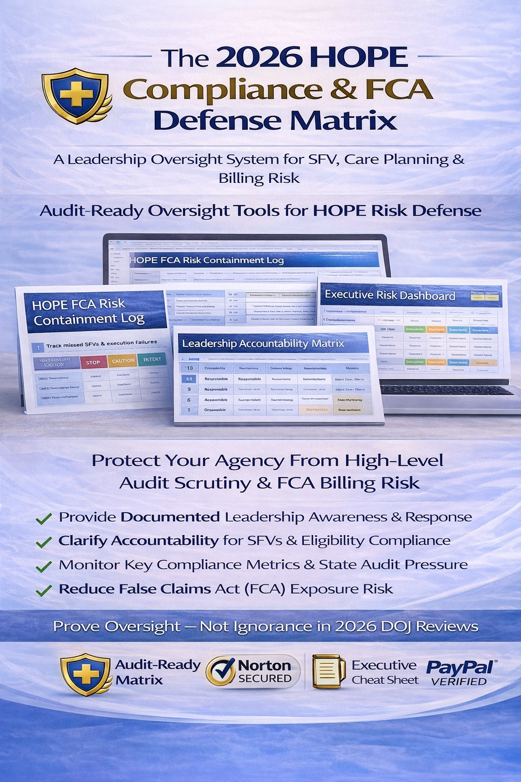 Tool IncludedPrimary FunctionHelps MitigateHOPE FCA Risk Containment LogTracks execution failures and corrective actionsFCA exposure, DOJ scrutinyRACI Accountability MatrixDefines roles and ownershipWorkflow gaps, accountability breakdownsExecutive Compliance DashboardMonitors key performance indicatorsAPU risk, submission thresholdsState Risk Exposure MatrixFlags jurisdiction-specific scrutinyState Medicaid enforcementMedical Director Attestation LogVerifies eligibility narrative oversightCertification & eligibility findings