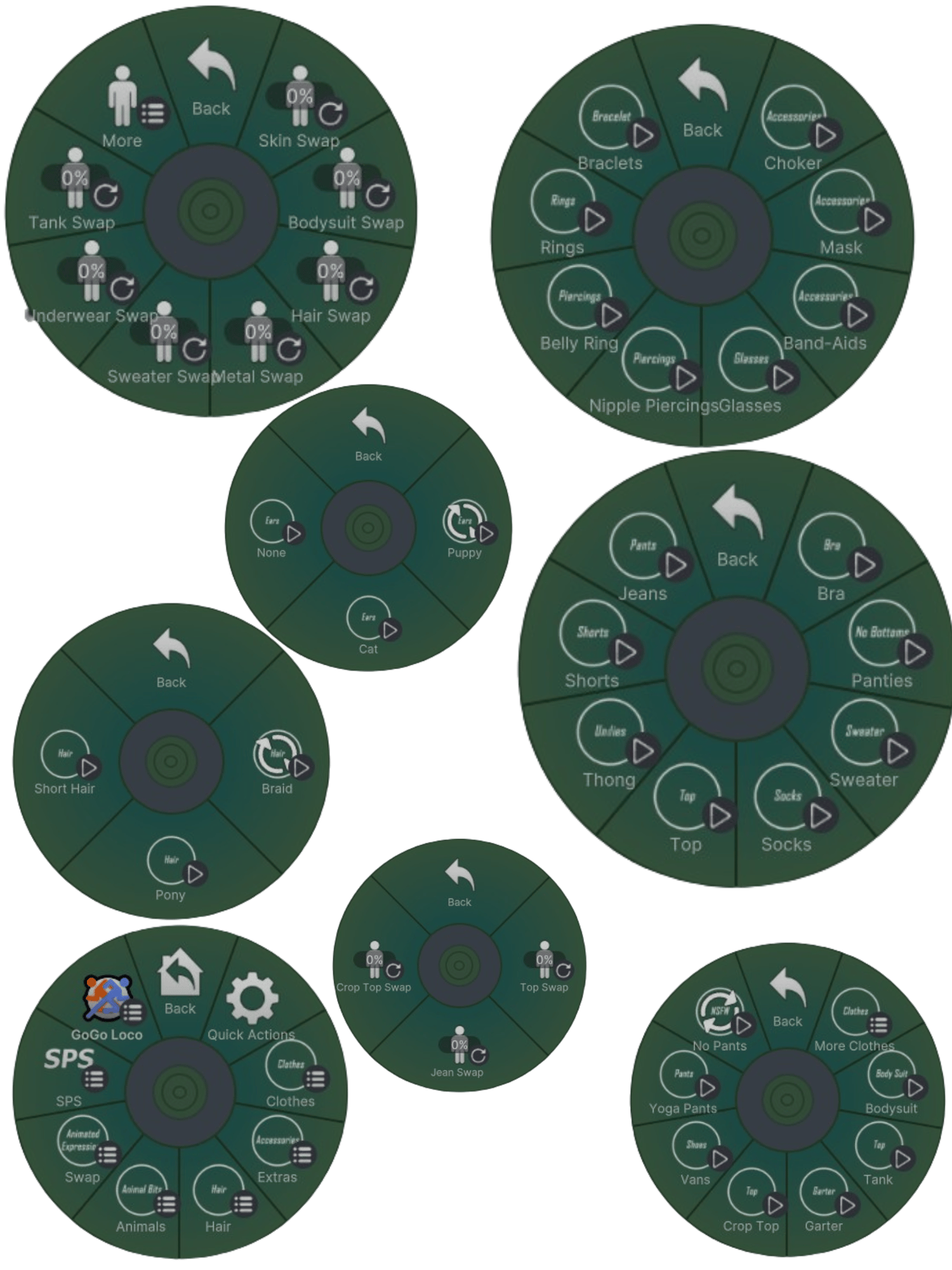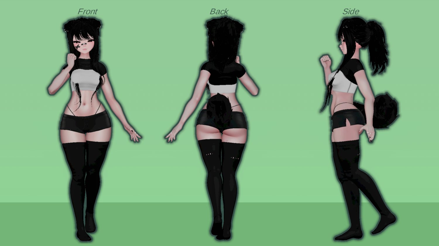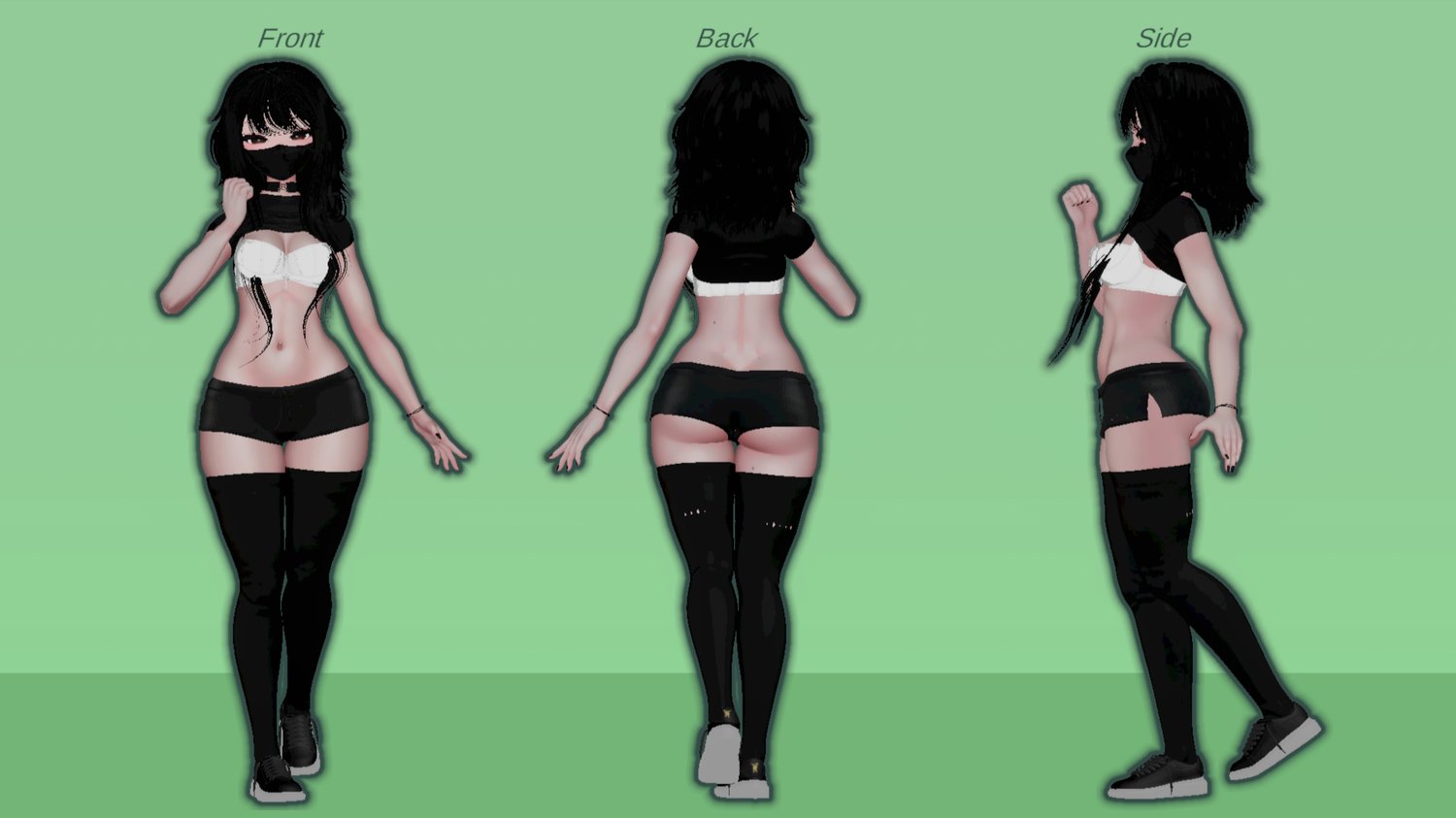 Bodysuit, Tank, Garter Belt, Crop top, Shoes, Yoga Pants, Bra, Panties, Sweater, Socks, Top, Thong, Shorts, Jeans, Choker, Mask, Band-aids, Glasses, Piercings, Rings, Bracelets, Cat and Dog animal parts, And Three Hair(one, Two, three) Styles, Body and Head, GoGo, Eye Texture, Icons, SPS