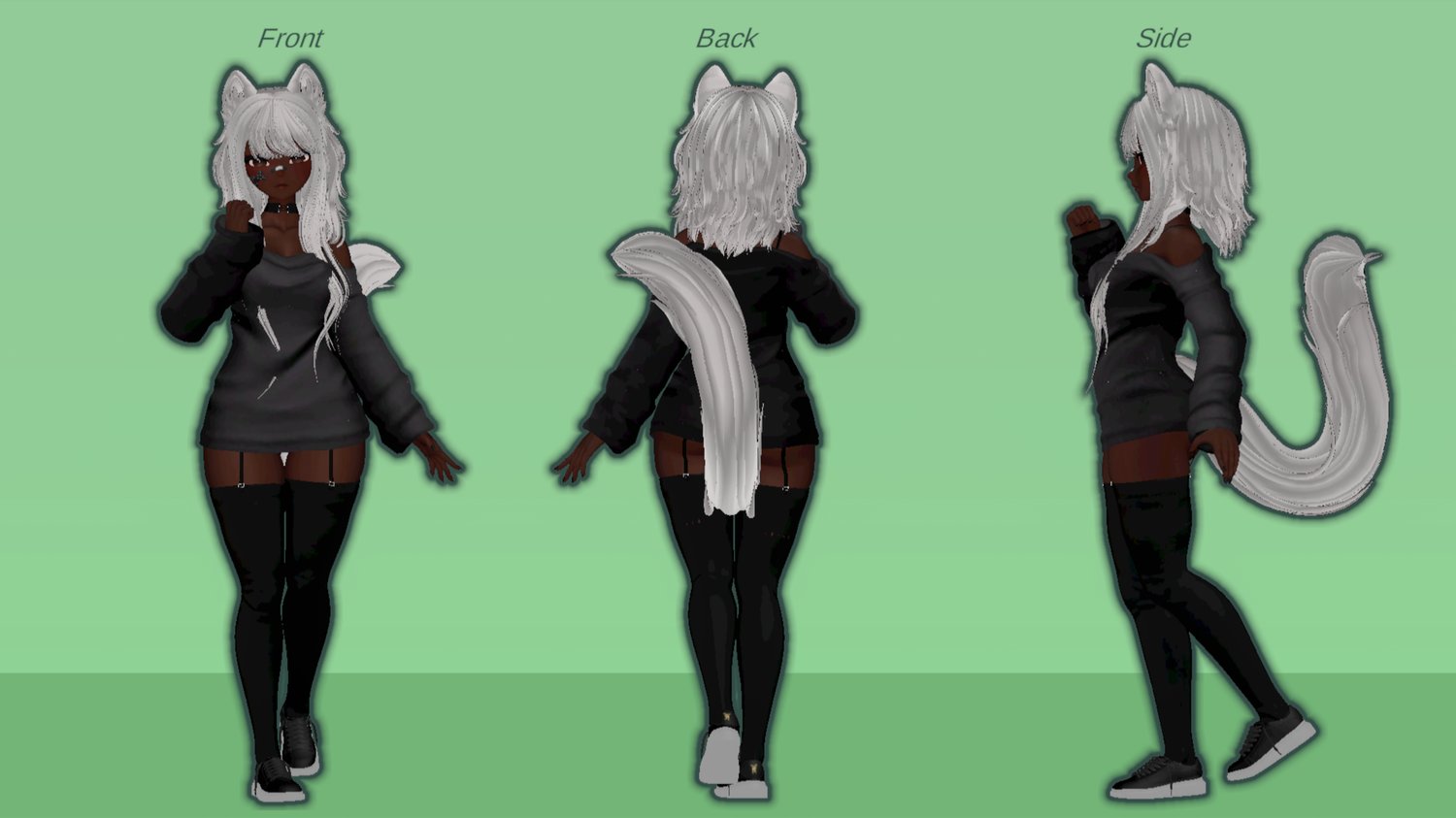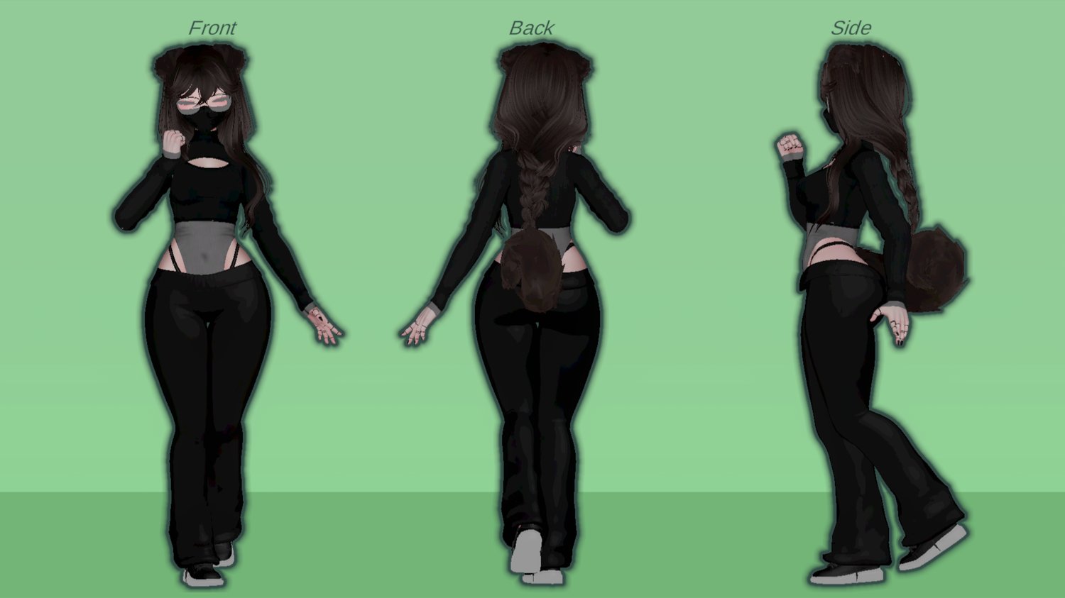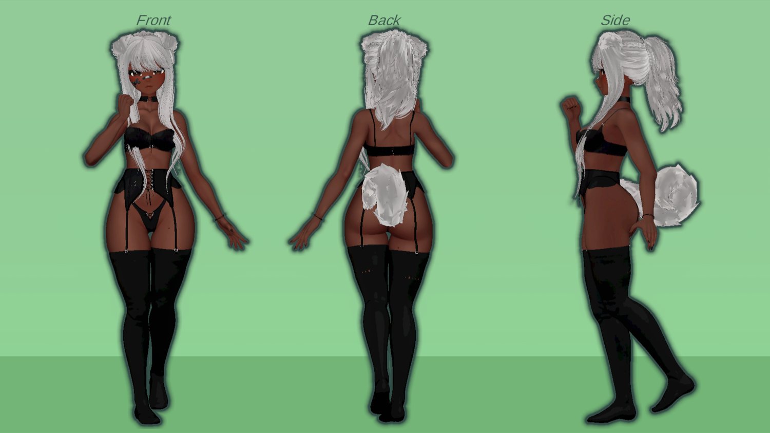 Bodysuit, Tank, Garter Belt, Crop top, Shoes, Yoga Pants, Bra, Panties, Sweater, Socks, Top, Thong, Shorts, Jeans, Choker, Mask, Band-aids, Glasses, Piercings, Rings, Bracelets, Cat and Dog animal parts, And Three Hair(one, Two, three) Styles, Body and Head, GoGo, Eye Texture, Icons, SPS