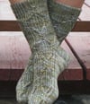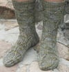 These socks are worked from the cuff down. The pattern includes written instructions and charted stitch patterns. The pattern includes woman's small, medium and large sizes with options for short and long leg lengths and three foot lengths.