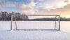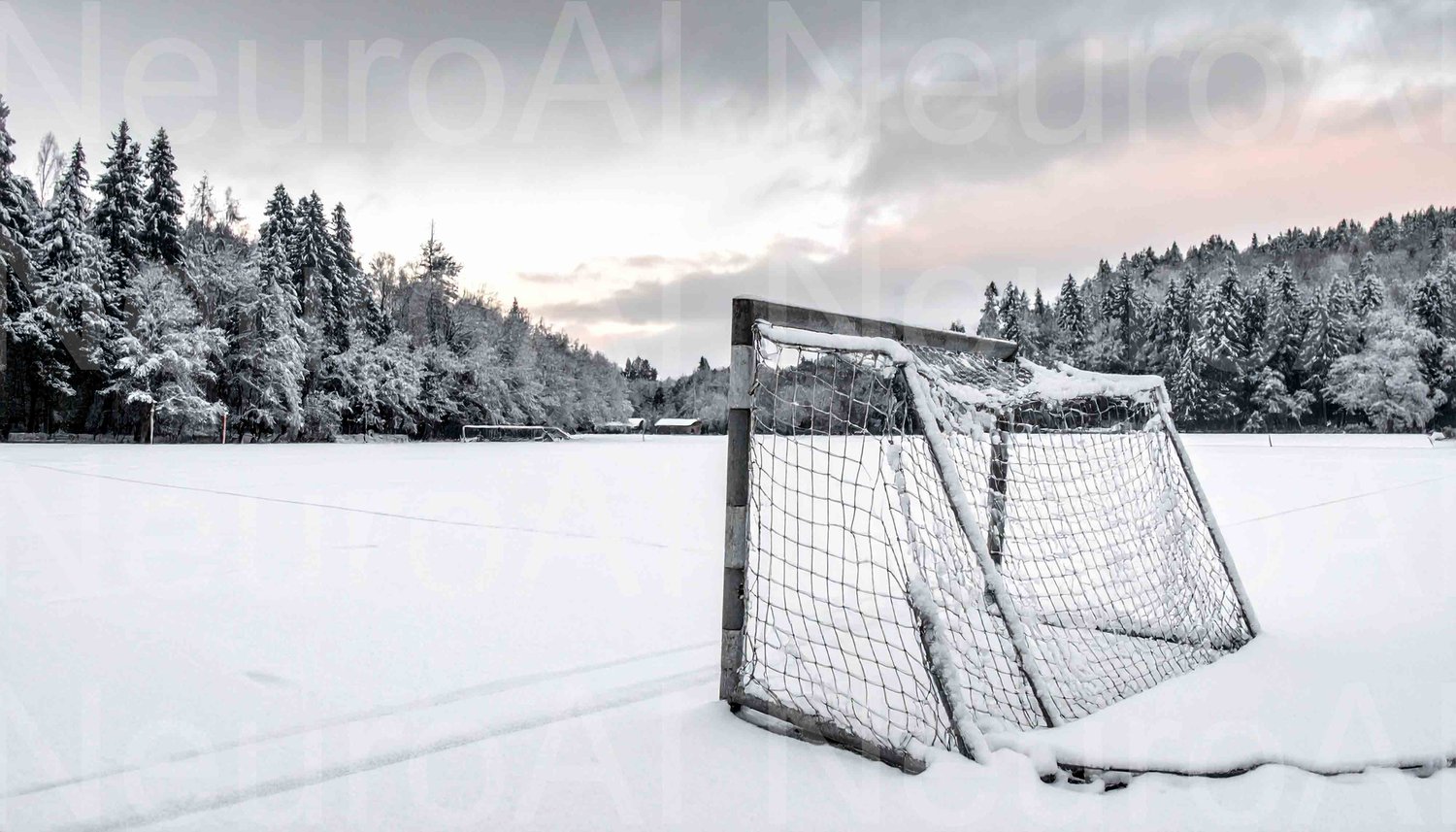 Snowy soccer field, winter wonderland dreamscape