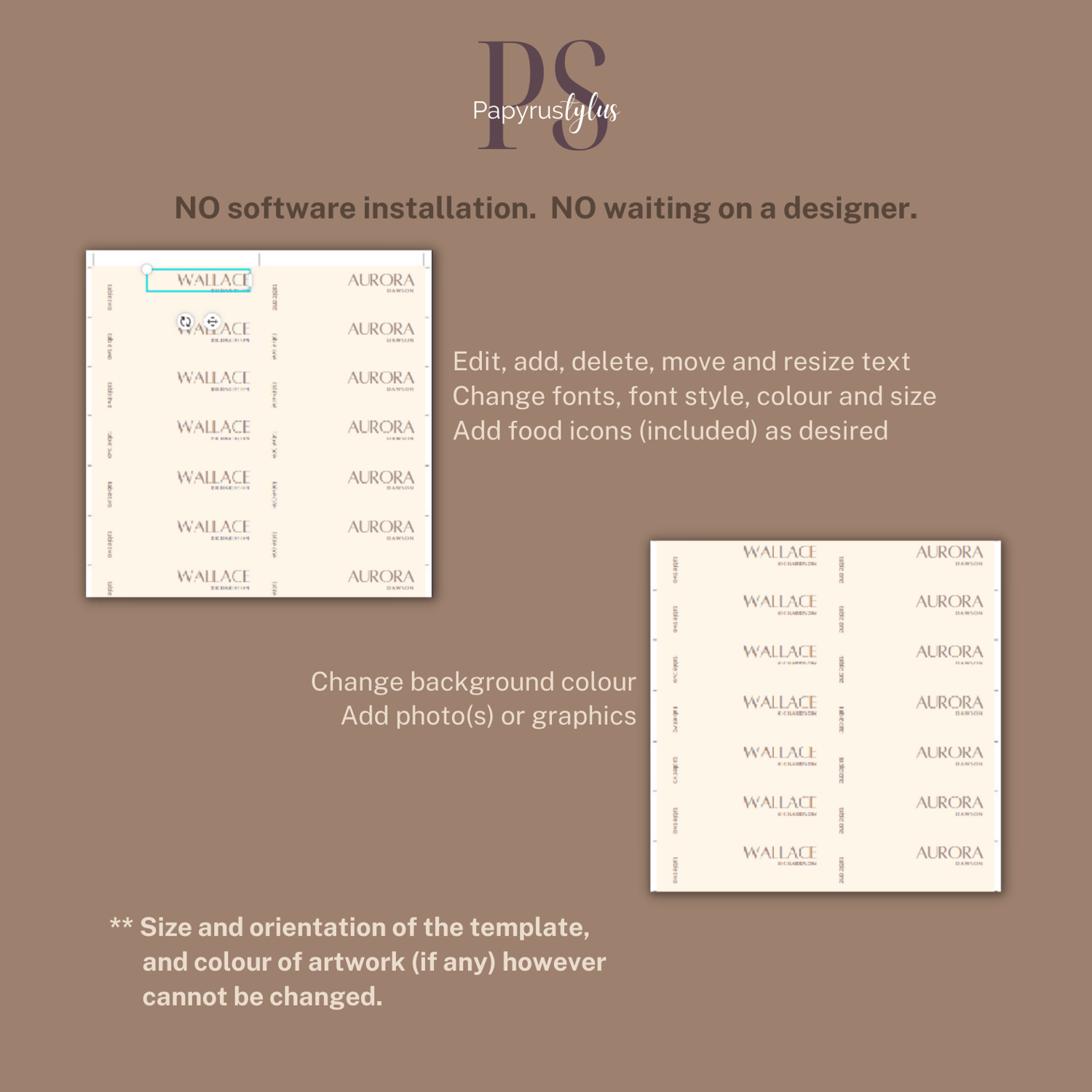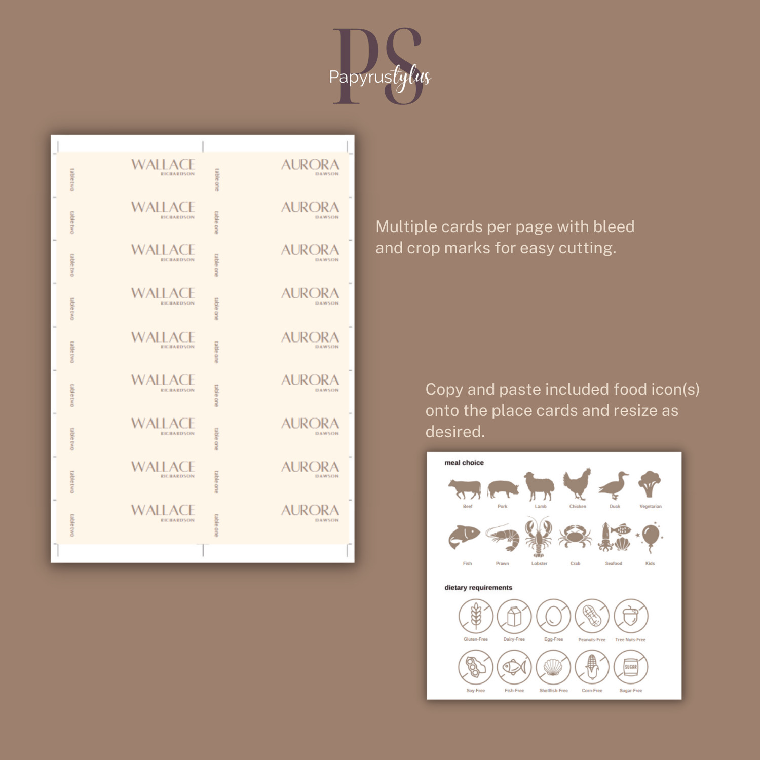 Customisable in Canva:- One template of 16 cards per page for printing on US letter sized cardstock, each place card measured 4.0 x 1.25in