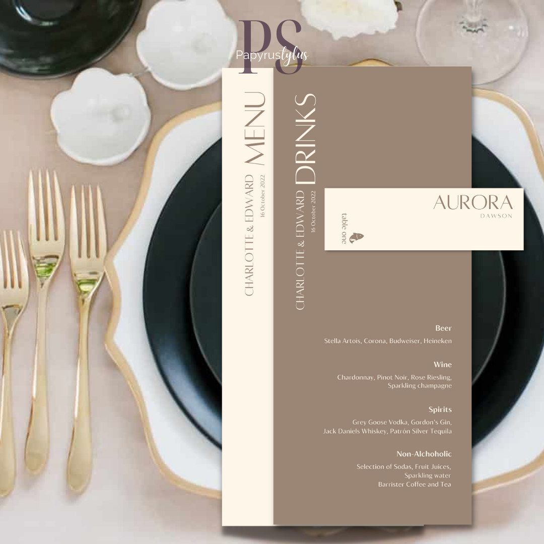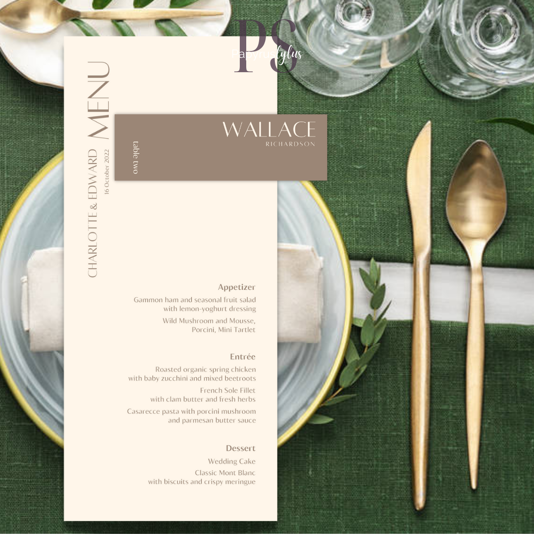 This thin wedding place card template presents the guest name in different font sizes and letter spacing, and comes in a set of two colours. It is chic on its own, beautiful to be paired with the menu and drinks list in the same series, and can be attached as a tag to the wedding gifts for your guests. You may change the font and colour to better match your event.