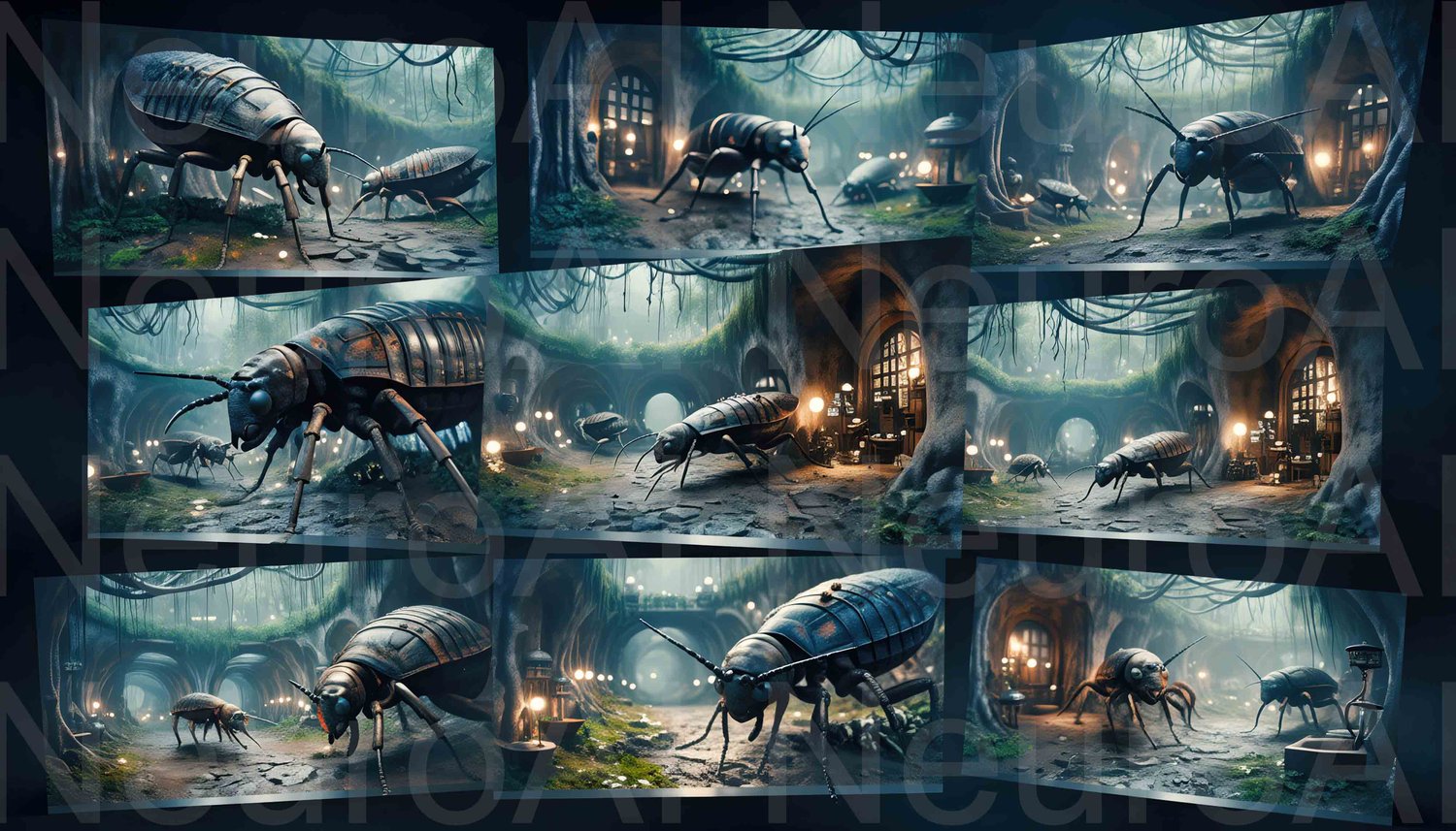 Giant bugs wander through enchanted forest home