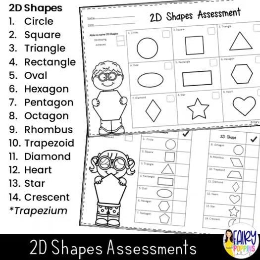✅ 3 × 2D Recording Sheets – Easily record each student’s ability to recognize and name 2D shapes.