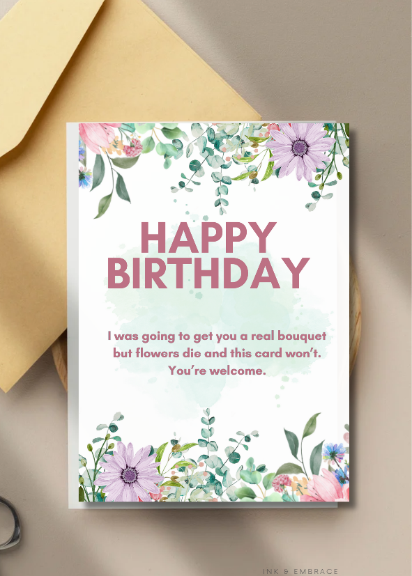Surprise your favorite person with a birthday card that’s as sassy as it is sweet! This printable floral birthday card features the funny quote: "I was going to get you a real bouquet but flowers die and this card won’t. You’re welcome." Perfect for besties, sisters, or anyone who appreciates a good laugh and a pretty design. Instantly downloadable, easy to print, and way better than dead flowers. Add a little humour to their special day!