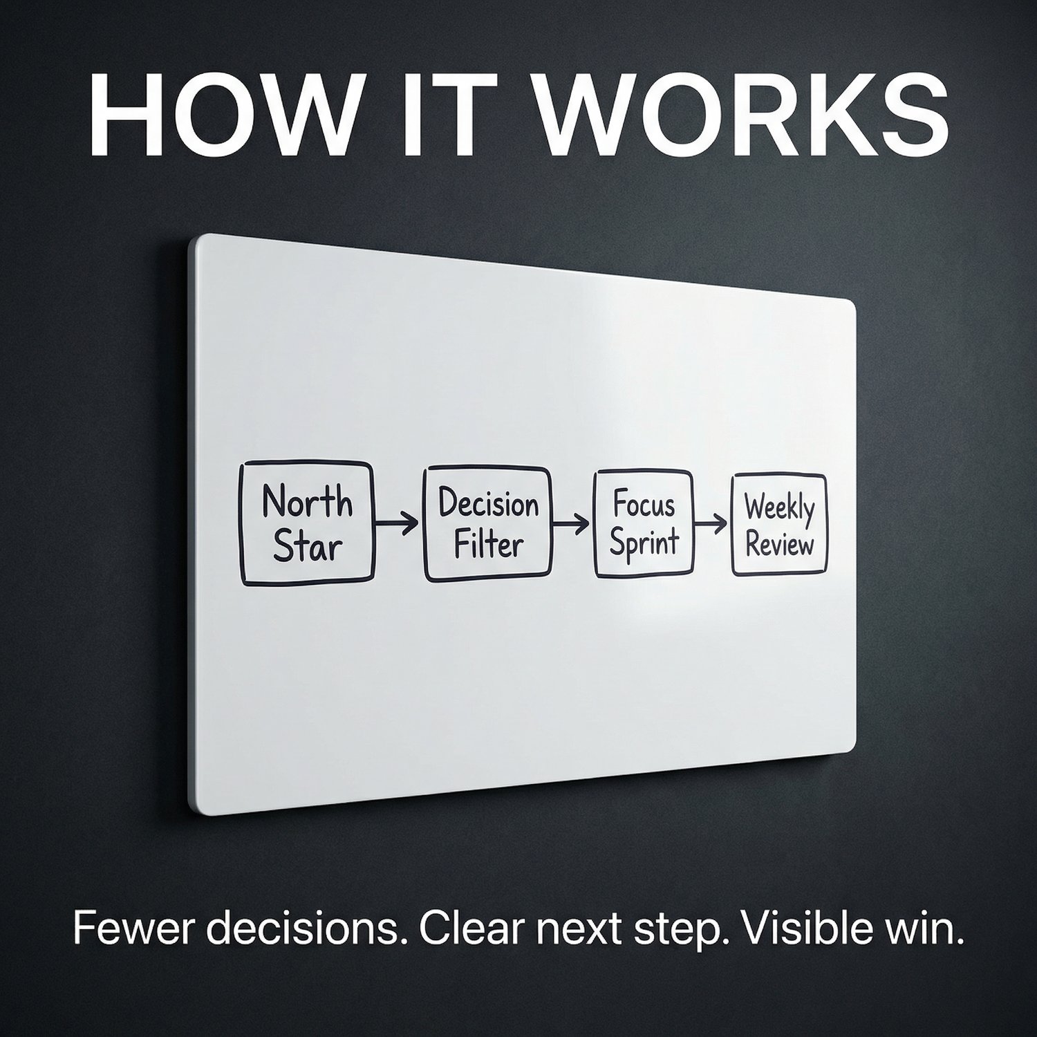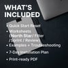 - Worksheets for North Star, decision filtering, focus sprint tracking, weekly review