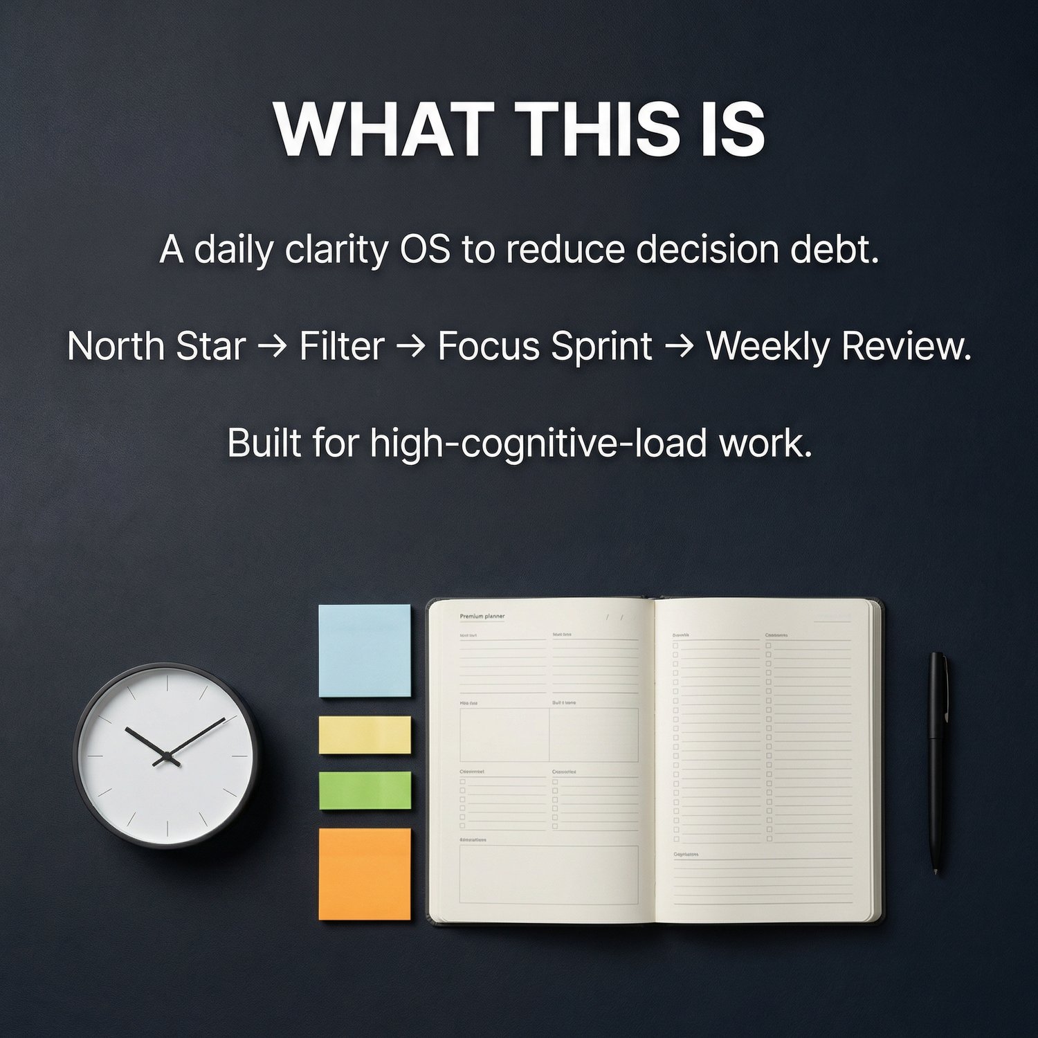 If everything feels urgent, it’s usually not a “time management” problem—it’s a decision debt problem. This planner is designed for high-cognitive-load operators who need a repeatable way to reset clarity, protect focus, and finish what matters.