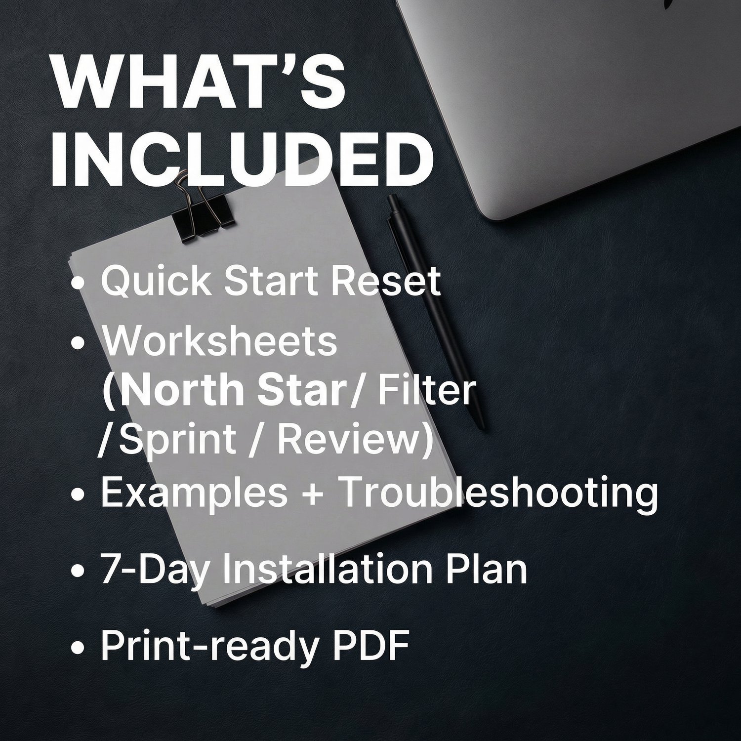 - A complete print-ready PDF playbook/planner (dark premium layout)