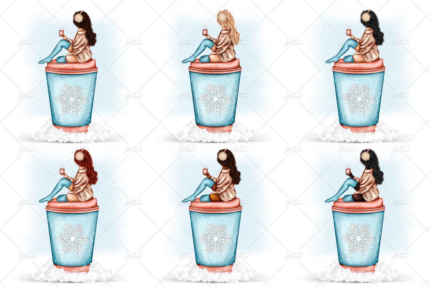 6 variations of Winter Hot Chocolate girls perfect for all kinds of sublimation projects such as mugs, coasters, bottles, makeup bags, t-shirts and more!