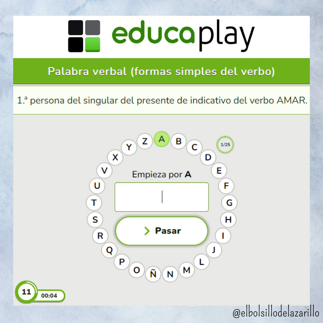 Se puede jugar a este Pasapalabra verbal en Educaplay, pero al final solo he compartido el rosco de las formas verbales simples en digital porque con las formas verbales compuestas y con el mix de formas verbales simples y compuestas me daba error a la hora de publicarlos en esta plataforma porque había verbos que no siempre empezaban por la letra que me interesaba. En el Pasapalabra verbal aparecen tanto verbos regulares como irregulares.