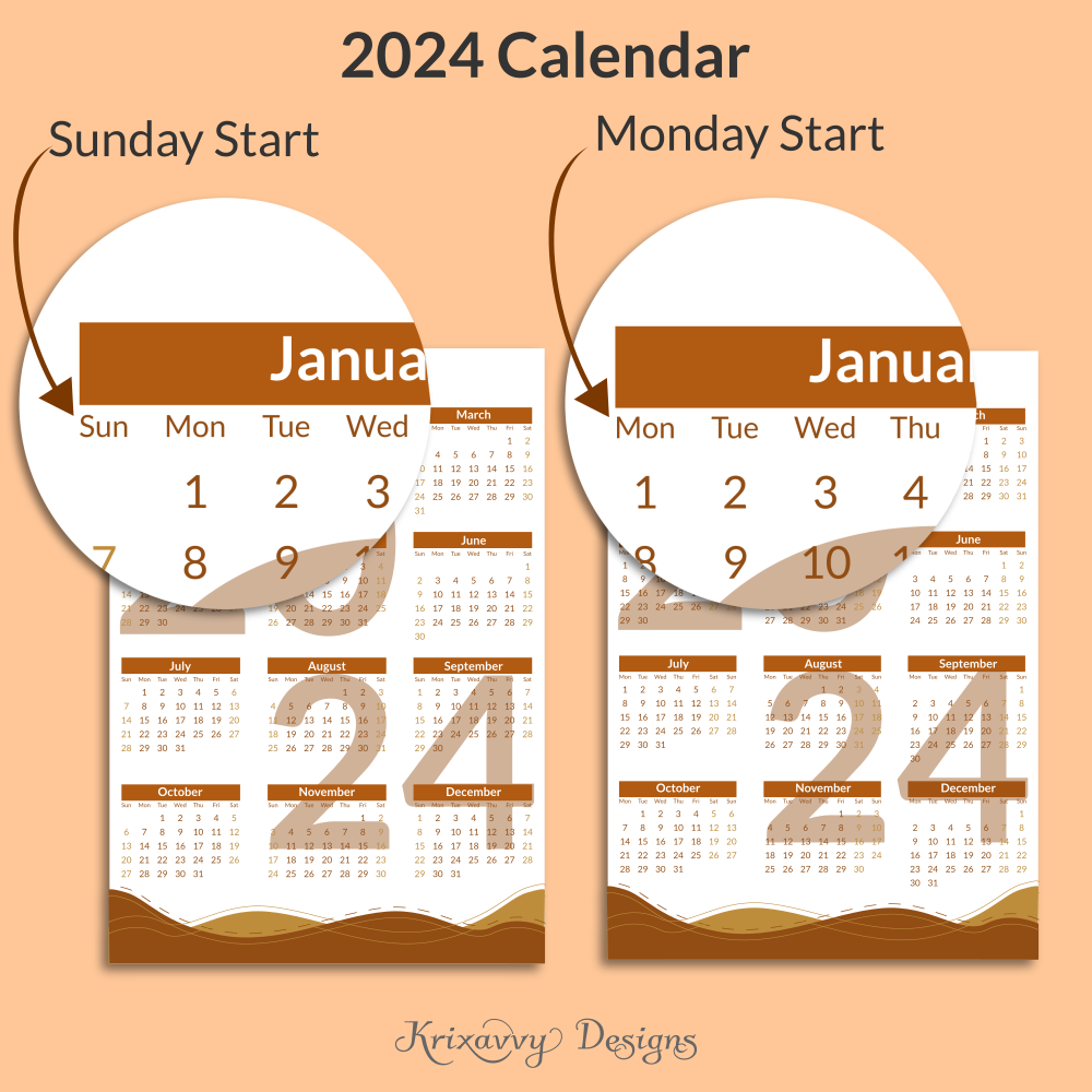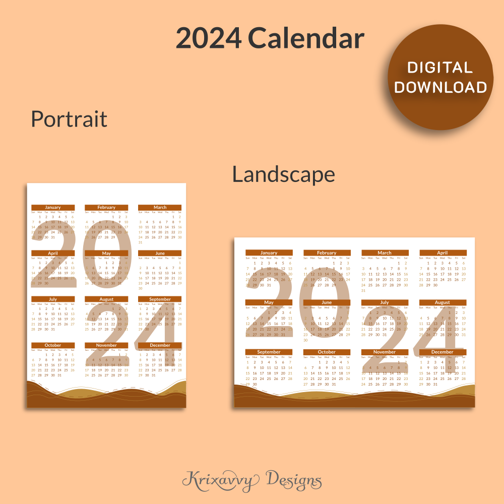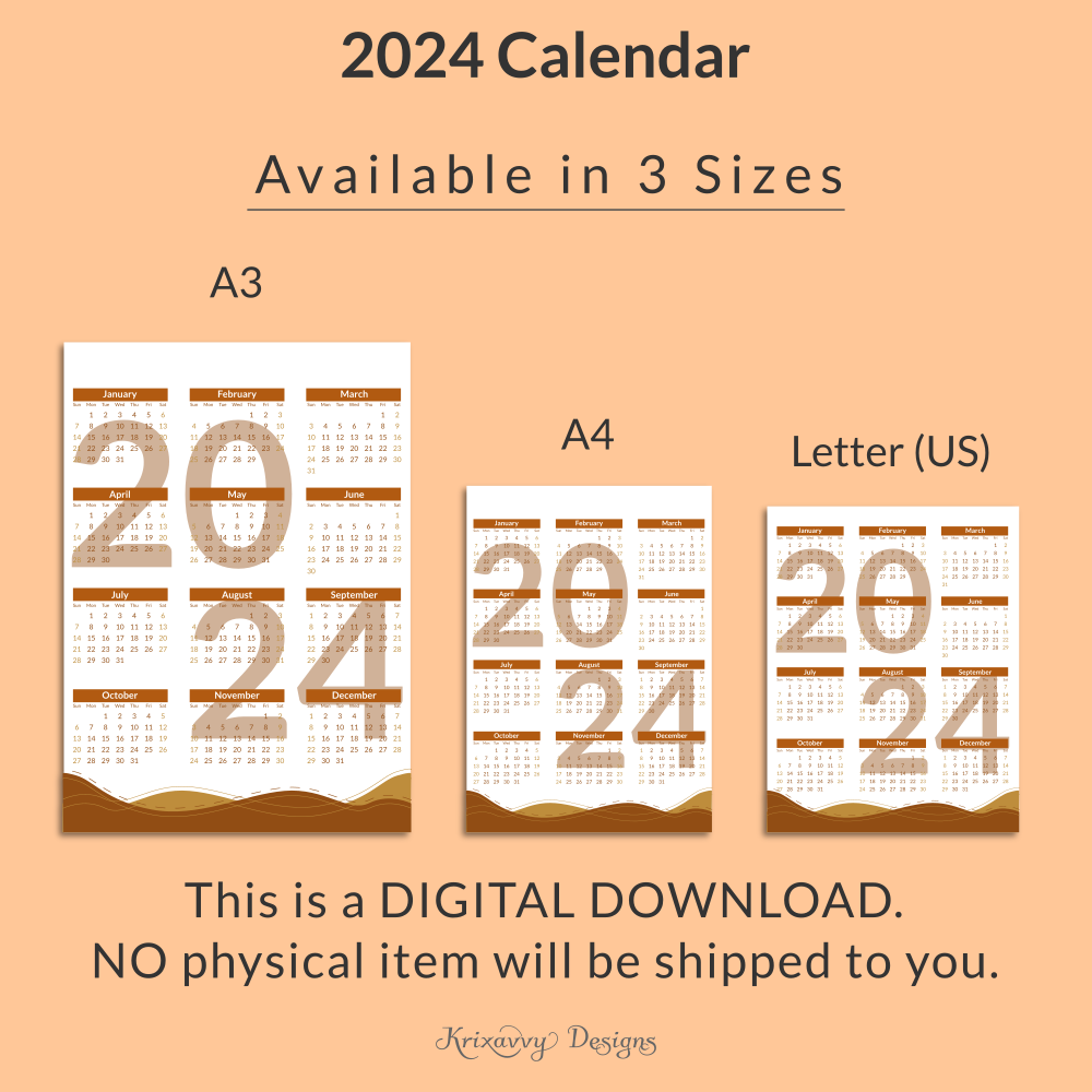 Printable Yearly Calendar | 2024 Calendar | 2024 Dated Calendar | Printable PDF | A4 Size | A3 Size | Letter (US Size) | Brown/ Chocolate/ Coffee Color
