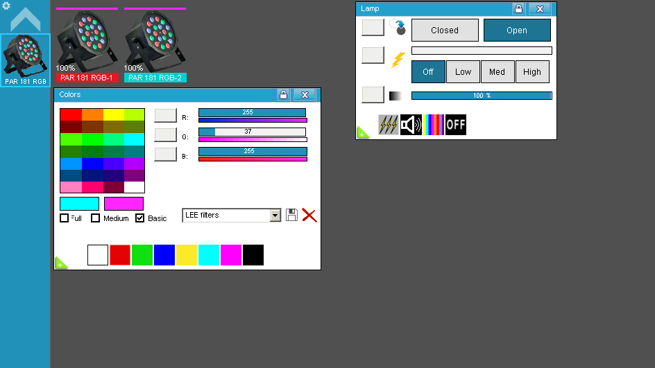 * Verifique, con un Fixture de pruebas (click), que coincidan estos canales: 1 Dimmer, 4 Azul, 5 Strobo.