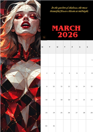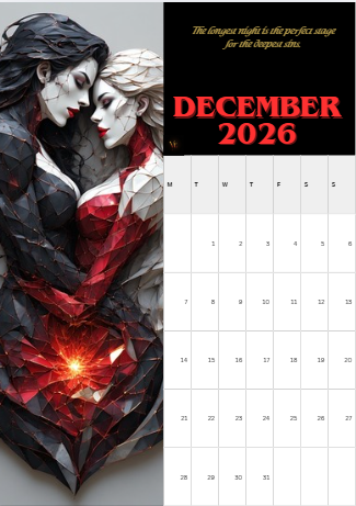 12 Exotic Portrait Scenes: High-detail artwork designed specifically for vertical display and mobile/tablet wallpapers. Shadow Whisper One-Liners: Each month features a seductive thought to set the mood, such as "The cold only makes the heat of the blood more inviting" (January) and "Desire is a ritual that requires no words, only breath" (May). * Professional Vertical Layout: Each page features the month and a clean 2026 calendar grid starting on Monday.