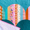 When It Rains is a jelly roll friendly bold clamshell quilt pattern. The big pieces and alternate block construction make this a great pattern for beginners to curved piecing. The pattern includes detailed step-by-step instructions and illustrations, a coloring page, and full-size printable pattern template pages.