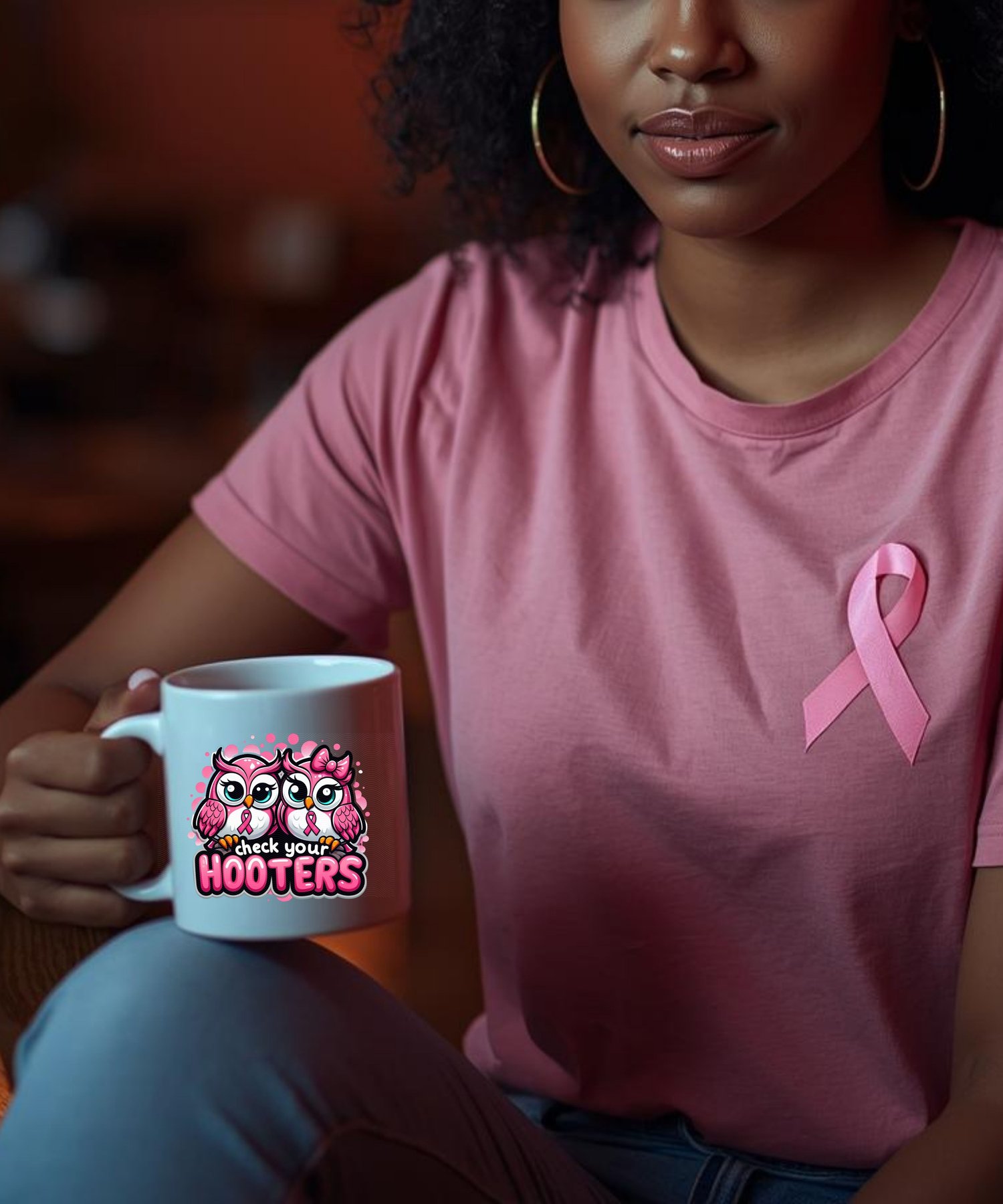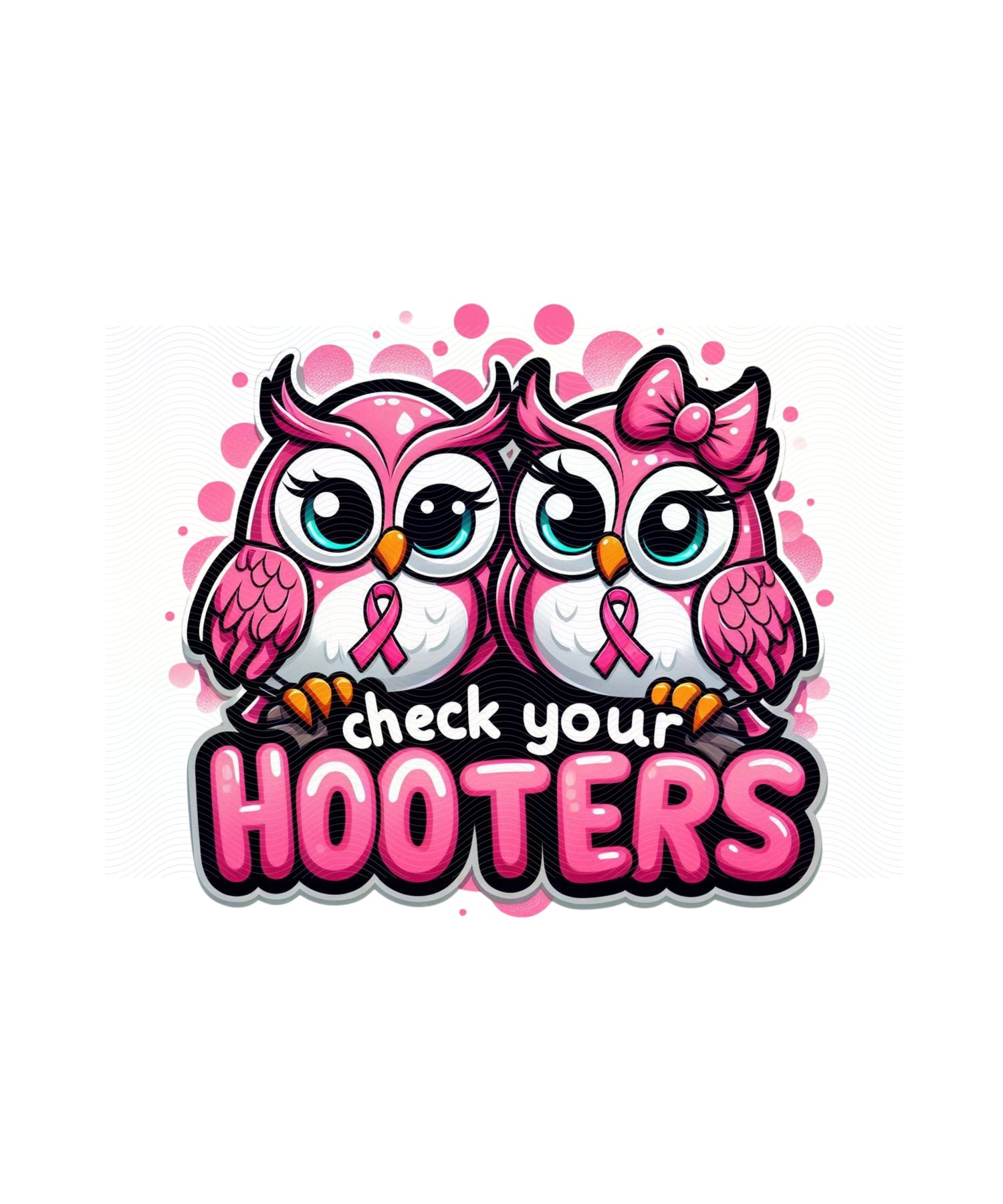 Spread breast cancer awareness with a playful twist! This “Check Your Hooters” design features adorable pink owls rocking pink ribbons — the perfect mix of cute and cheeky. Great for shirts, mugs, and tote bags to remind everyone to stay aware and get checked!
