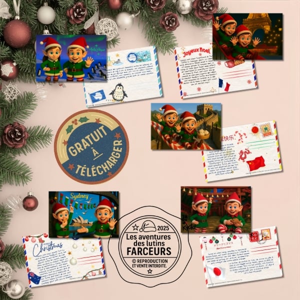 Découvrez les 11 cartes postales illustrées (lutin et lutine vert) qui racontent, étape par étape, le grand voyage des lutins farceurs depuis leur atelier secret jusqu’à chez vous. Chaque carte est une escale magique : forêt givrée, gare des rennes, douane des biscuits, tunnel des étoiles… Les enfants suivent le périple jour après jour, comme s’ils recevaient des nouvelles en direct du Pôle Nord.