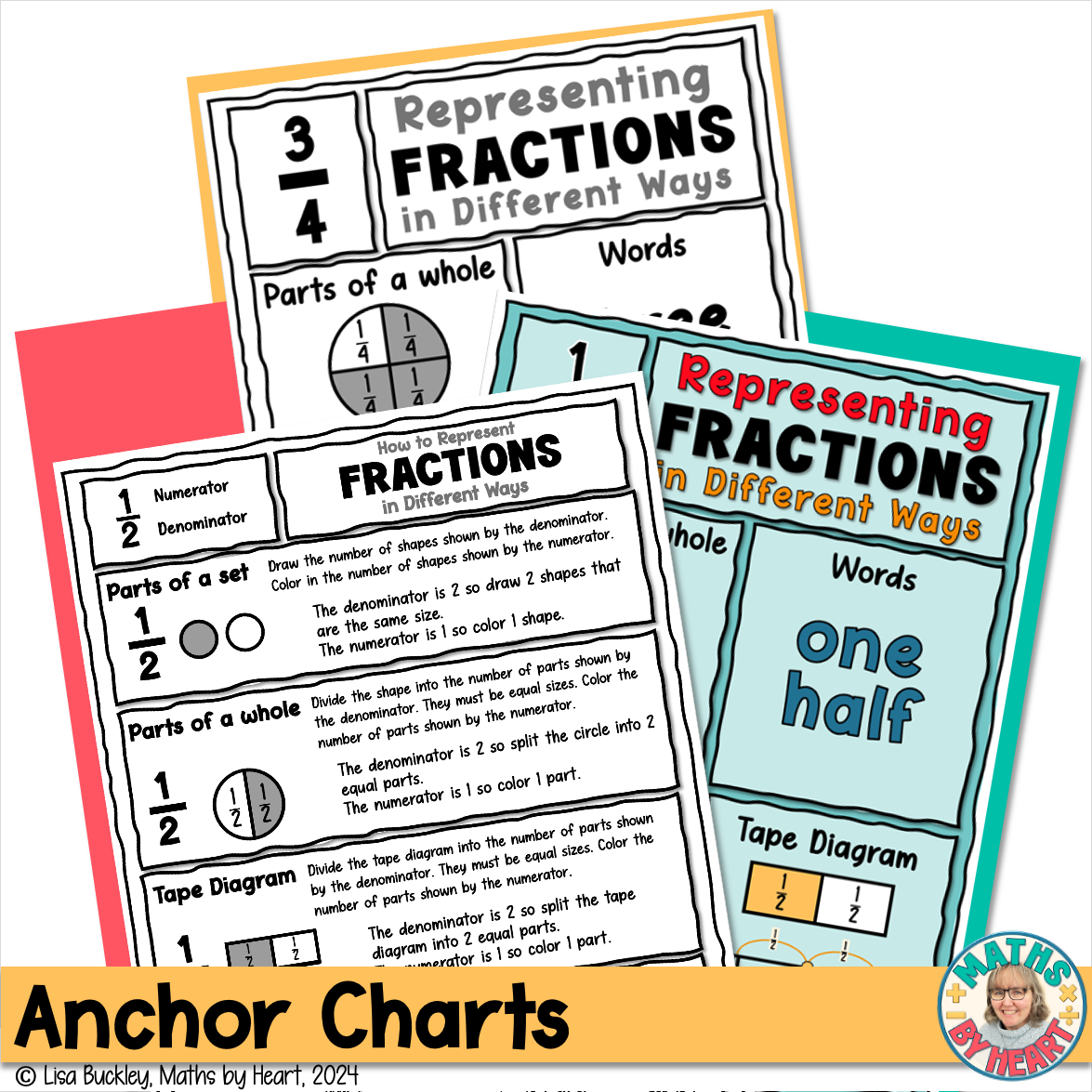 ✅ Anchor charts for ½ and ¾ in colour and b&w, & detailed chart explaining how to complete each representation.