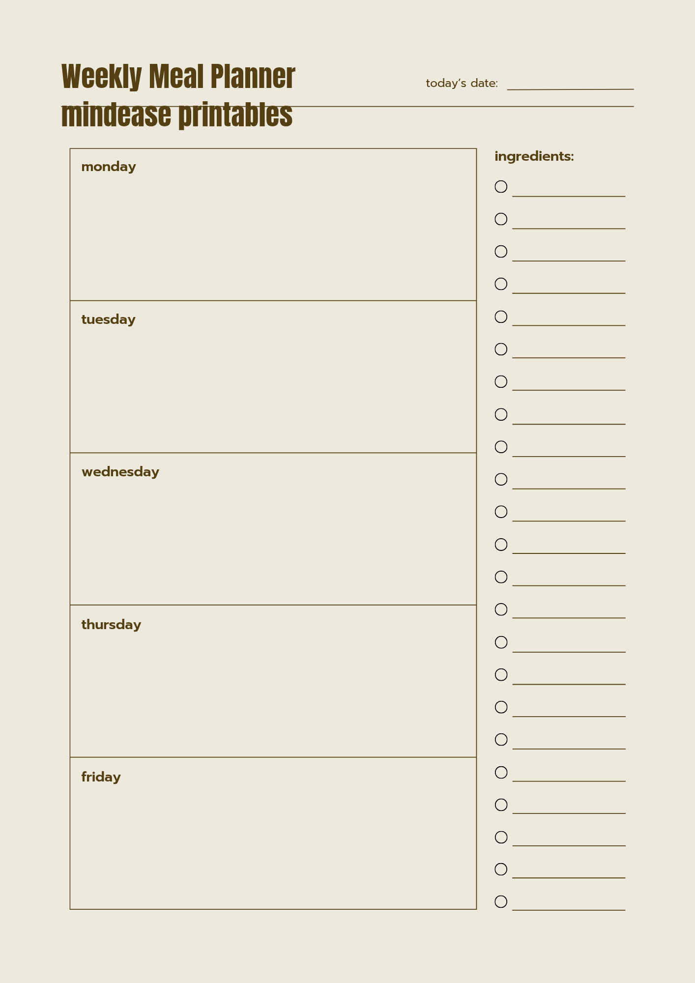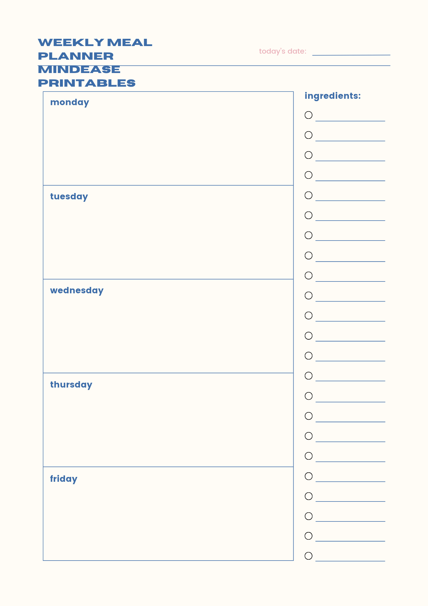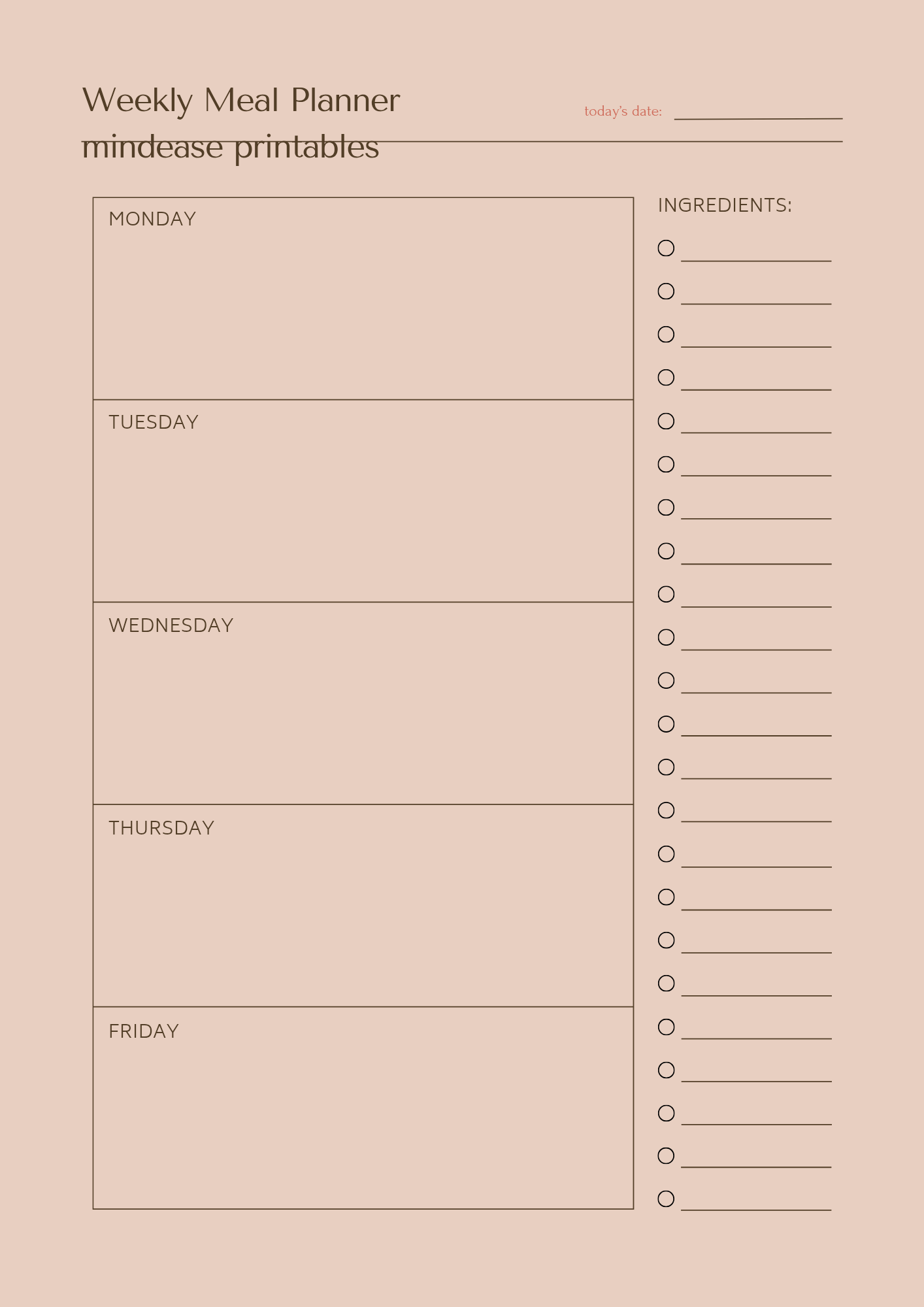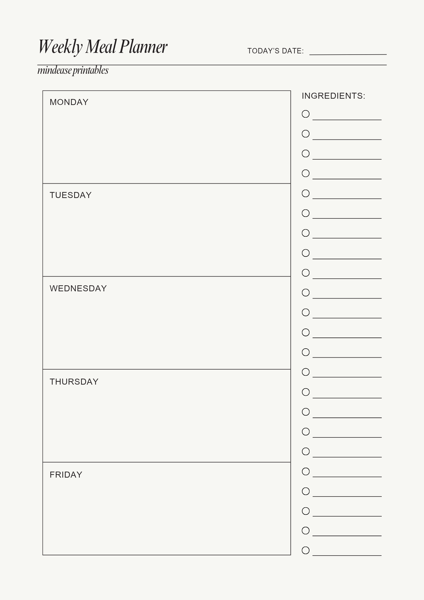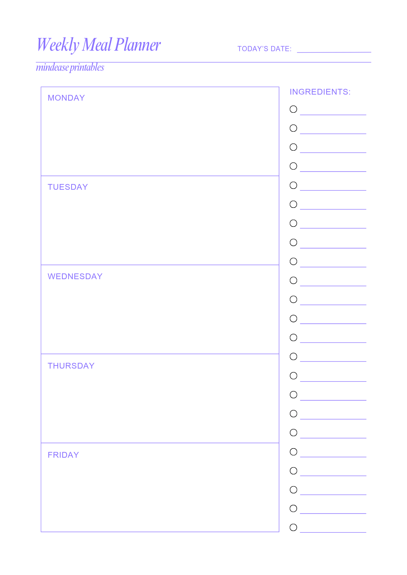 Take control of your week with this clean and easy-to-use Weekly Meal Planner. Designed to help you plan every meal ahead of time, this planner makes healthy eating simple and stress-free.