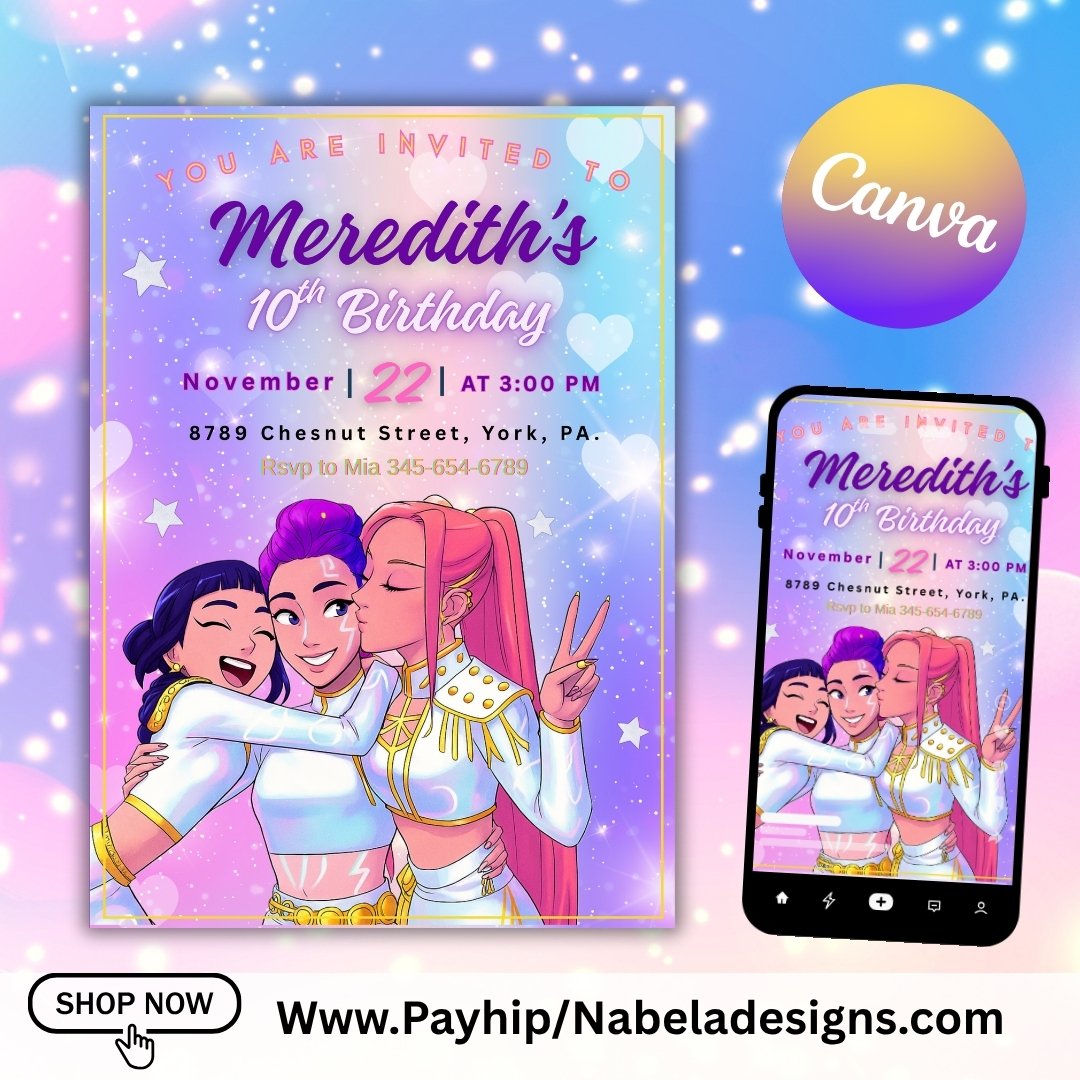 Bring the energy of a K-pop concert and the excitement of a fantasy adventure to your child’s birthday party with this Invitation! Designed with bold colors, neon lights, and anime-inspired characters, this invitation is perfect for young fans of music, dance, and magical heroes.
