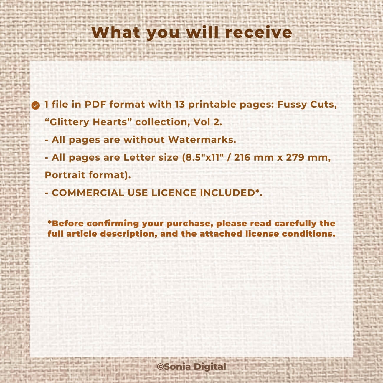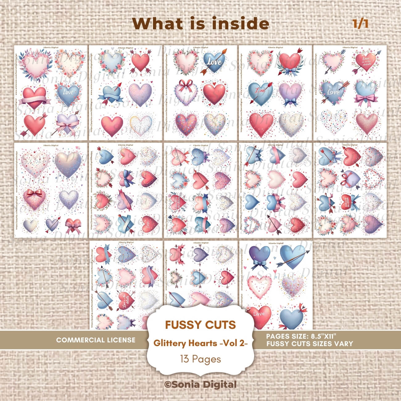🔸13 printable Fussy Cuts pages, “Glittery Hearts” Collection (Vol 2). In Letter size 8.5”x11” (Portrait format). All pages are watermark-free. Fussy Cuts Sizes vary. Commercial use license included*.