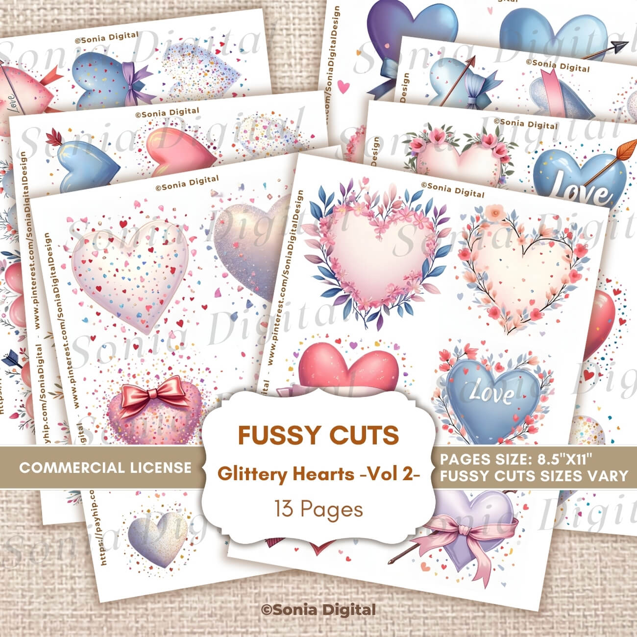 13 printable Fussy Cuts pages, “Glittery Hearts” Collection (Vol 2), for Scrapbooking and Junk Journal creations. Pages are Letter sized (8.5”x11”). Commercial use license included*.