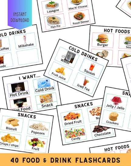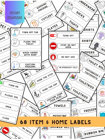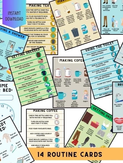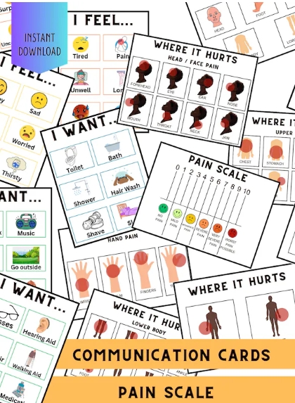 Editable in Canva: flashcards, communication cards, life story book, routine signs, daily prompts, food/drink visuals, pain scale, mood checkers & more
