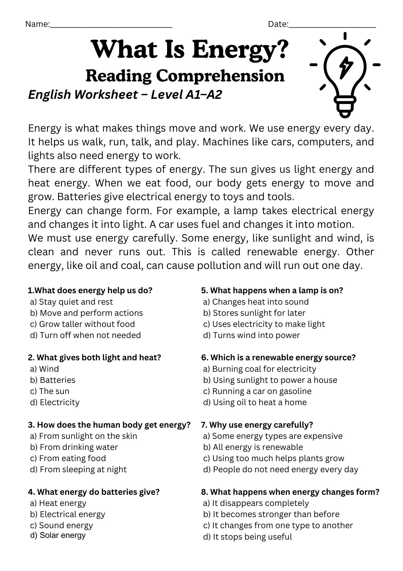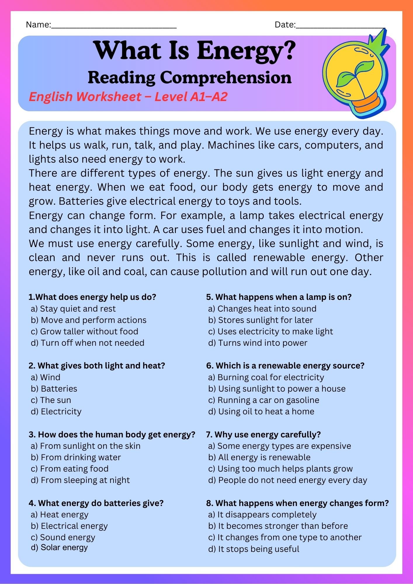 This engaging reading comprehension worksheet is designed for beginner to elementary English learners (A1–A2 level). Students will read a clear, simple text about energy, its sources, and how it is used in everyday life.