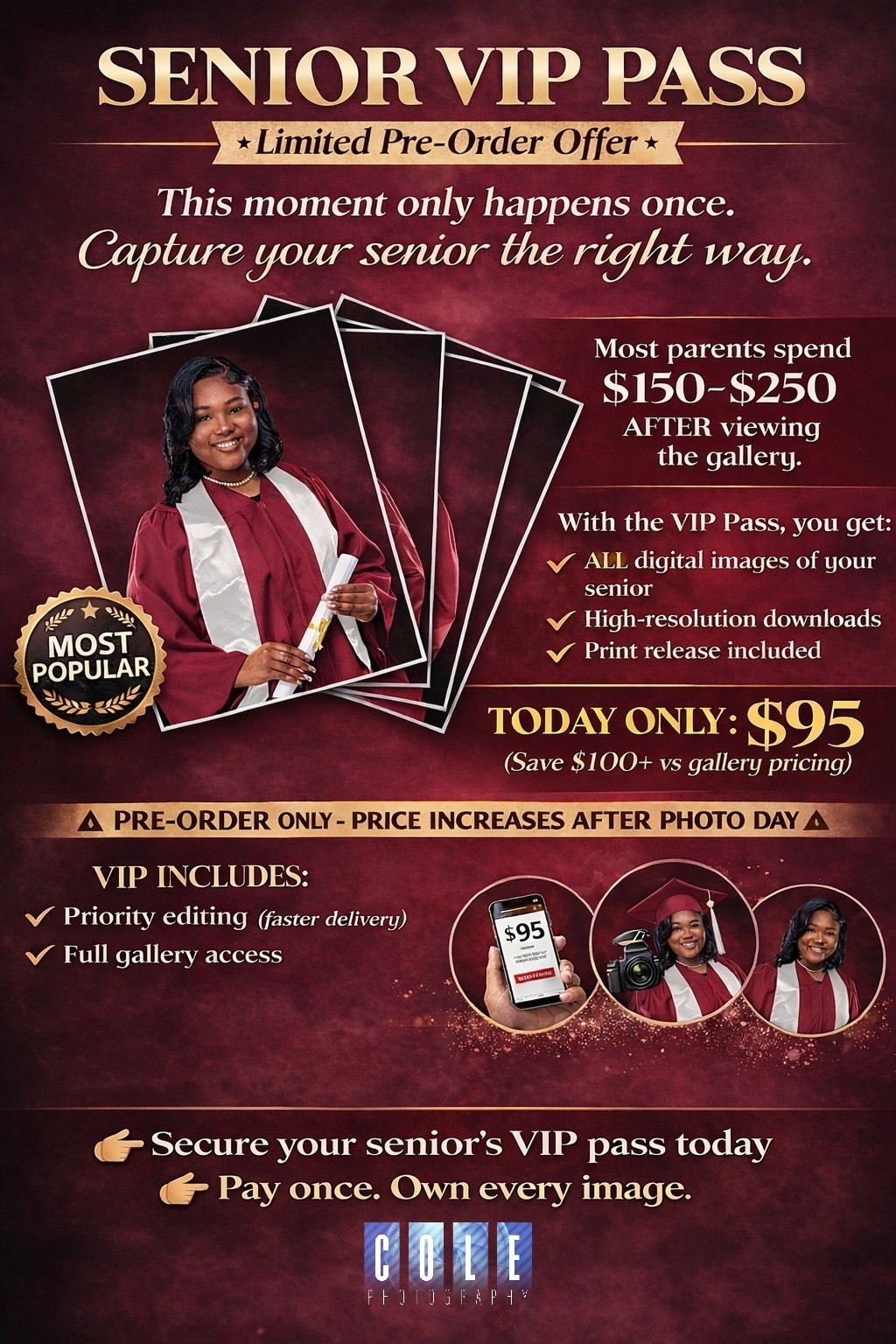 Get ALL your senior’s images before photo day and save over $100.