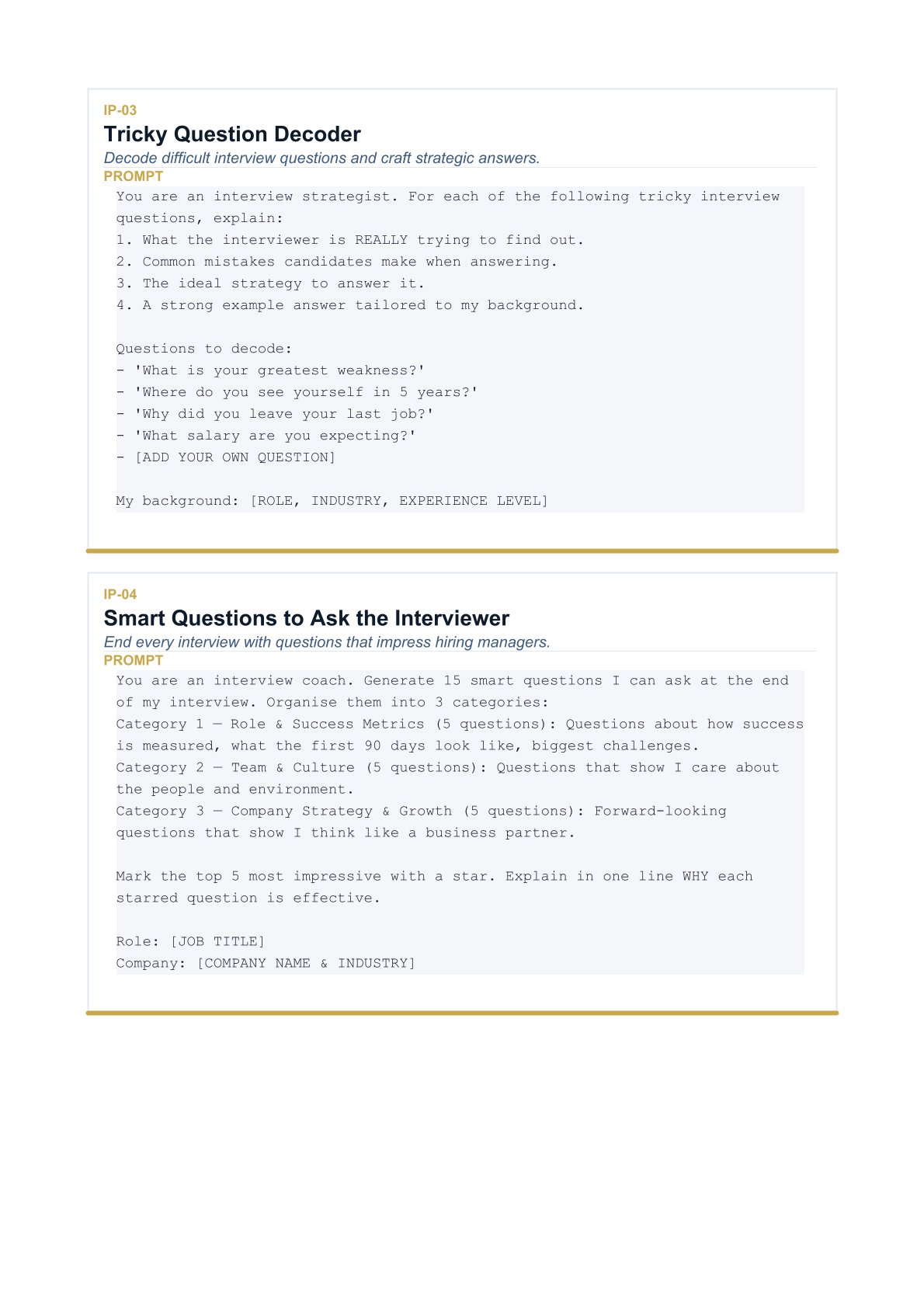 Inside you'll find prompts for: ✅ Writing an ATS-beating resume in minutes ✅ Cover letters that actually get read ✅ A LinkedIn profile that attracts recruiters ✅ Acing any interview with confidence ✅ Pivoting careers with a clear action plan