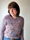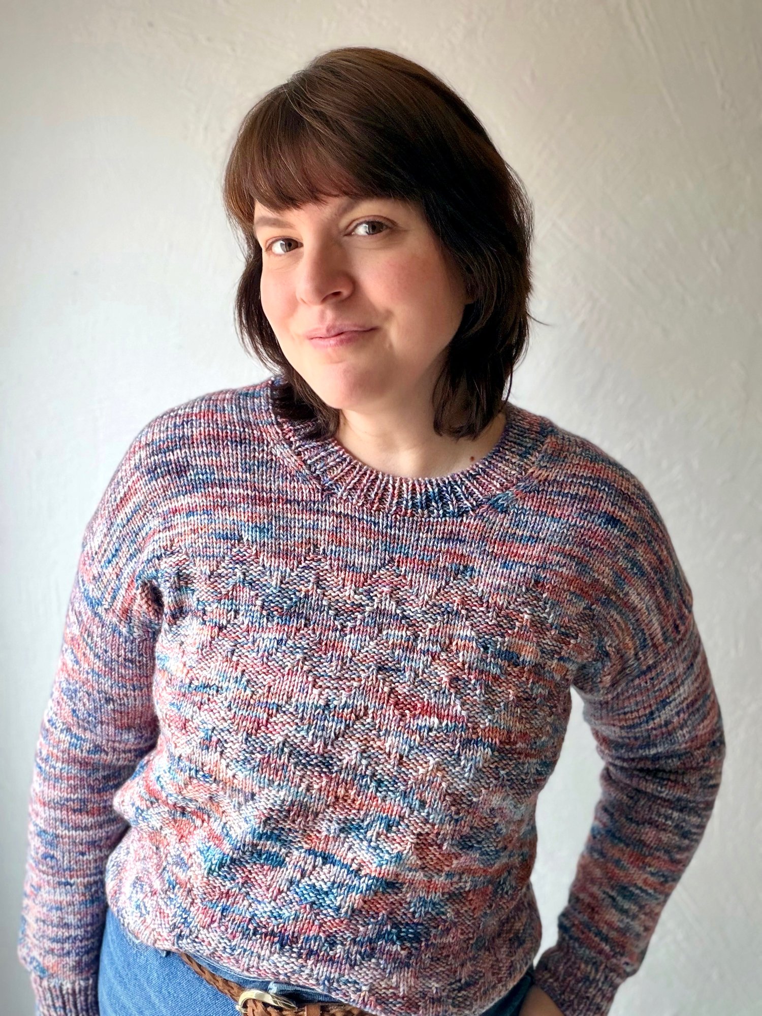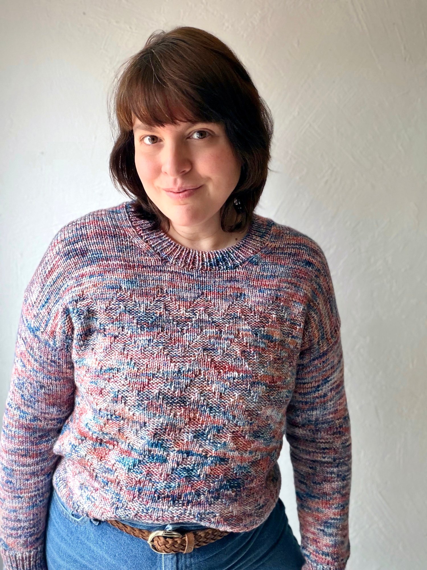 Pour ce modèle, je me suis fixé un défi clair: travailler un fil très bigarré sans céder à la facilité du jersey intégral. La texture a été pensée pour trouver sa place dans ce tableau de couleur dense, en créant un équilibre sans prendre le dessus.