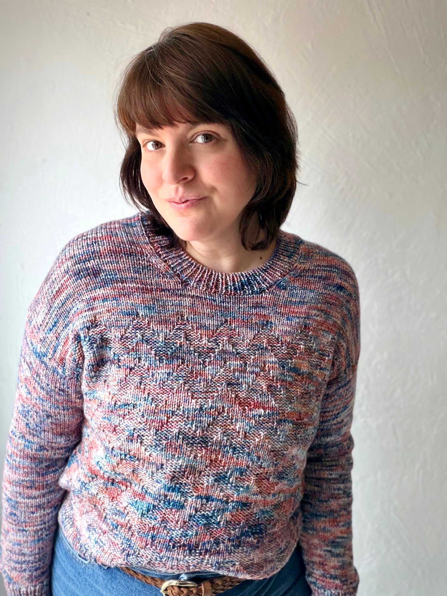 Stonecreek is a comfortable, top down sweater worked in one piece. The textured motif on the front adds depth while allowing the color to remain the main focus, shifting subtly with the light.