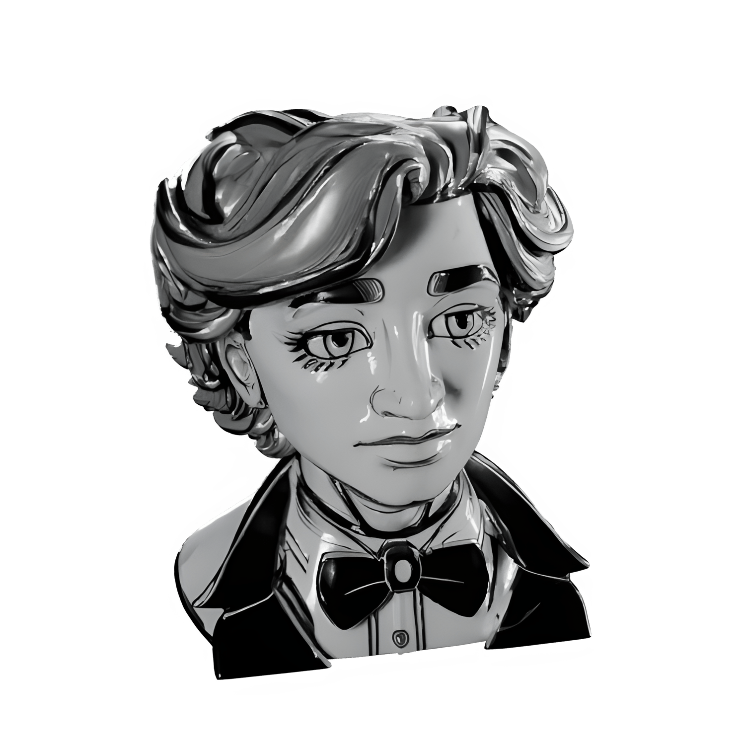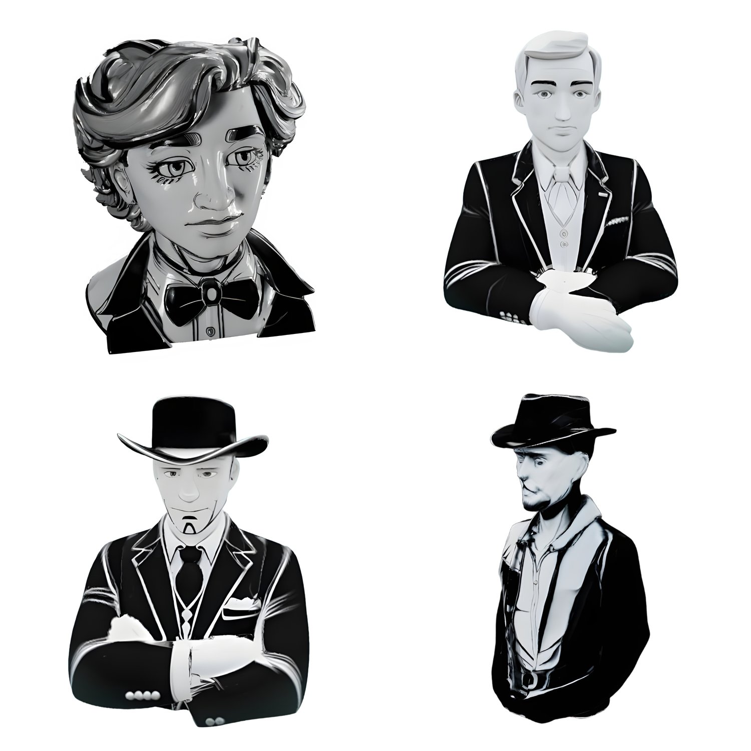 Hey there! This is a gorgeous collection of vintage-style character busts designed with a beautiful monochromatic noir aesthetic. The collection features four distinct characters, each capturing different personalities with amazing detail: