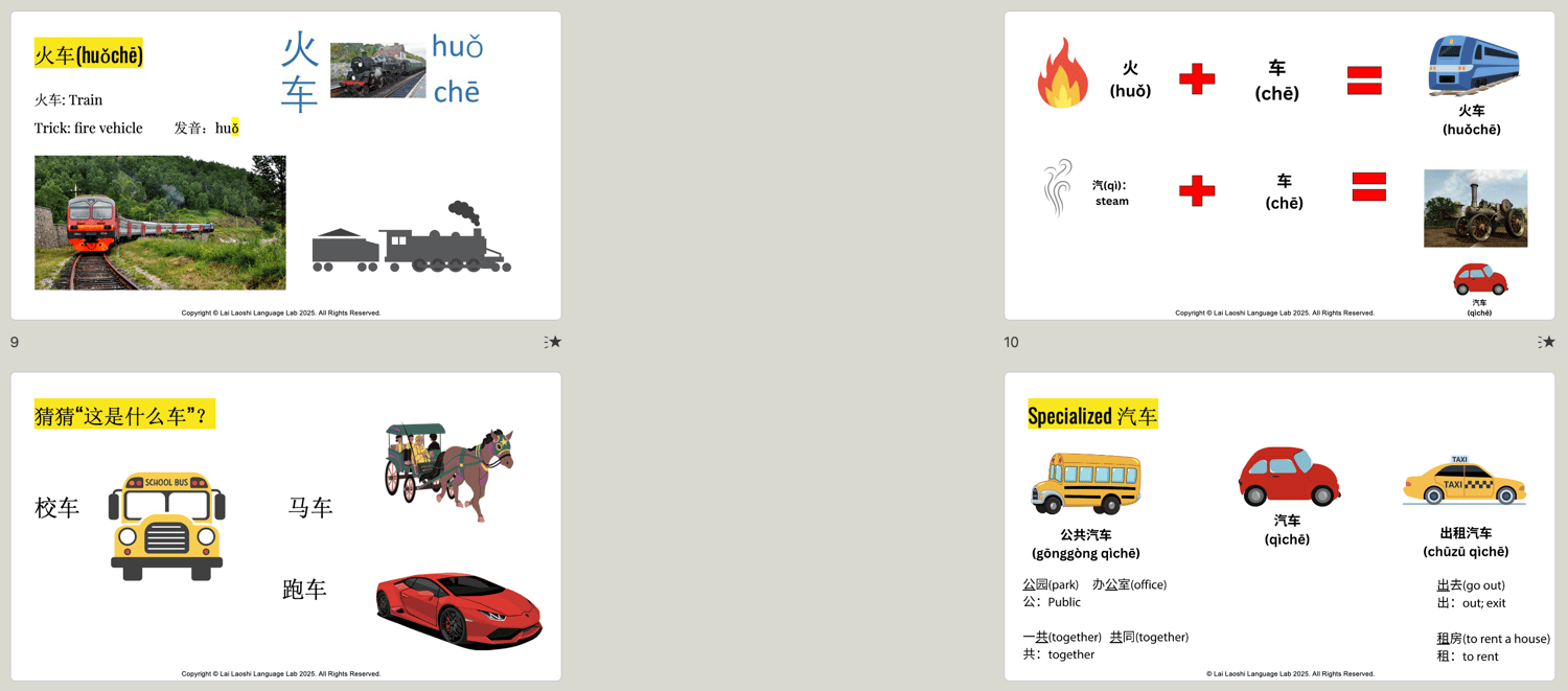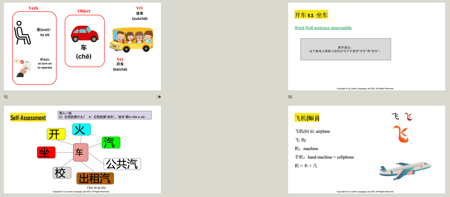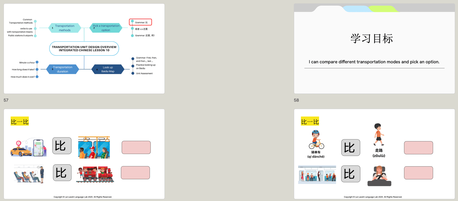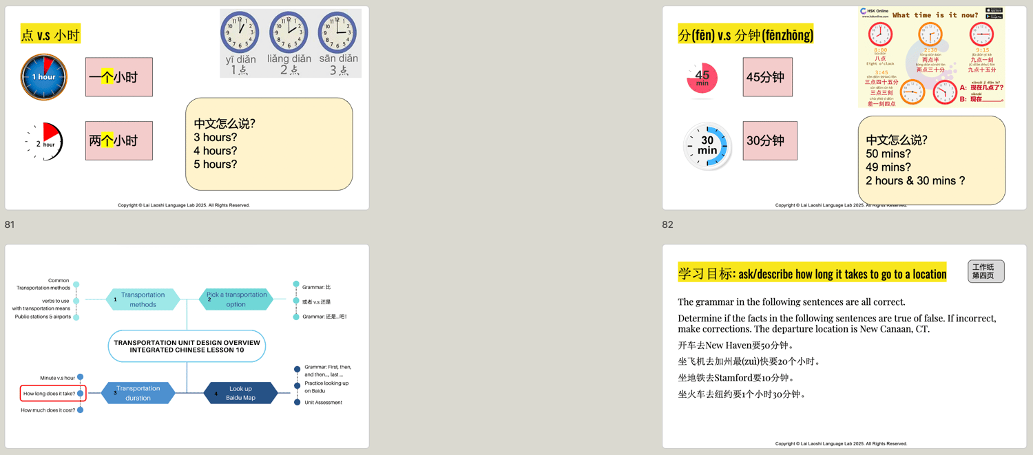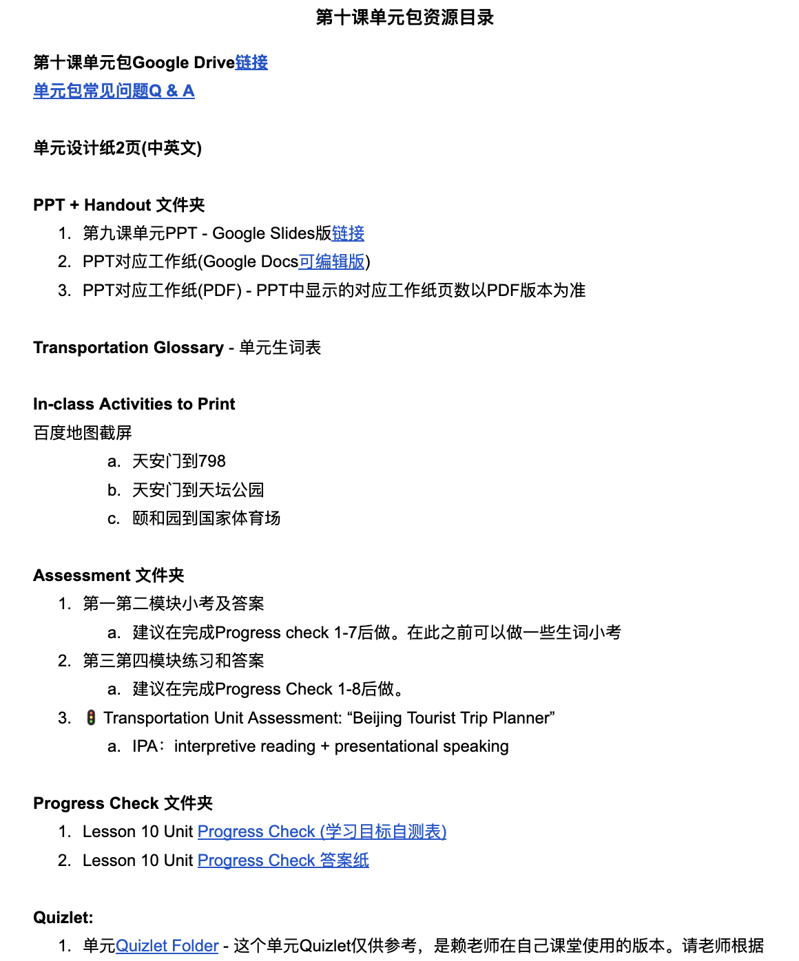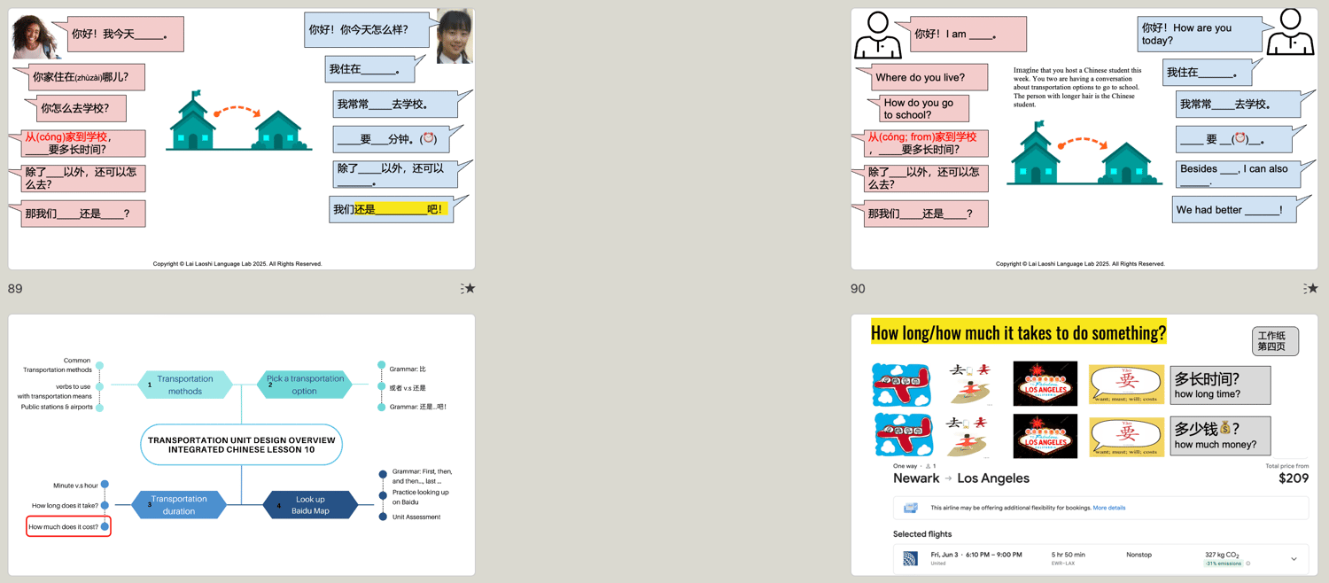 这套“交通工具”单元包,采用反向设计(backward design)原理精心打造,围绕《中文听说读写》(Integrated Chinese) 第十课《交通工具》的核心词汇和语法点,通过地图解读、真实生活模拟、以及口语输出训练,帮助学生在实用语境中掌握出行表达能力,并培养使用中文解决实际问题的能力。
