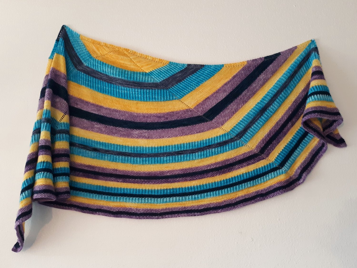 Gauge: Approximately 20 sts / 44 rows to 4” / 10 cm in blocked Stockinette Stitch pattern. I blocked the pattern rather aggressively, resulting in a particularly large row gauge. Exact gauge is not critical for this pattern as long as you are comfortable with the resulting fabric and size of the shawl; keep in mind that a different gauge may require a different yardage/meterage of yarn.